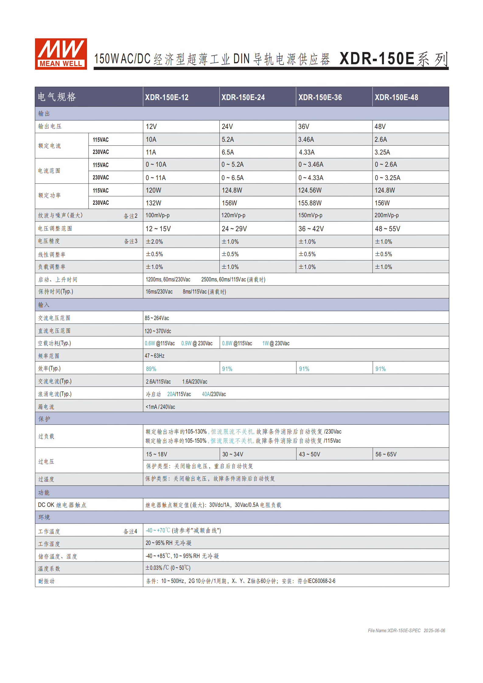 問題 1:XDR-150E 系列電源的輸出規(guī)格差異(按型號)及核心電氣性能亮點是什么?