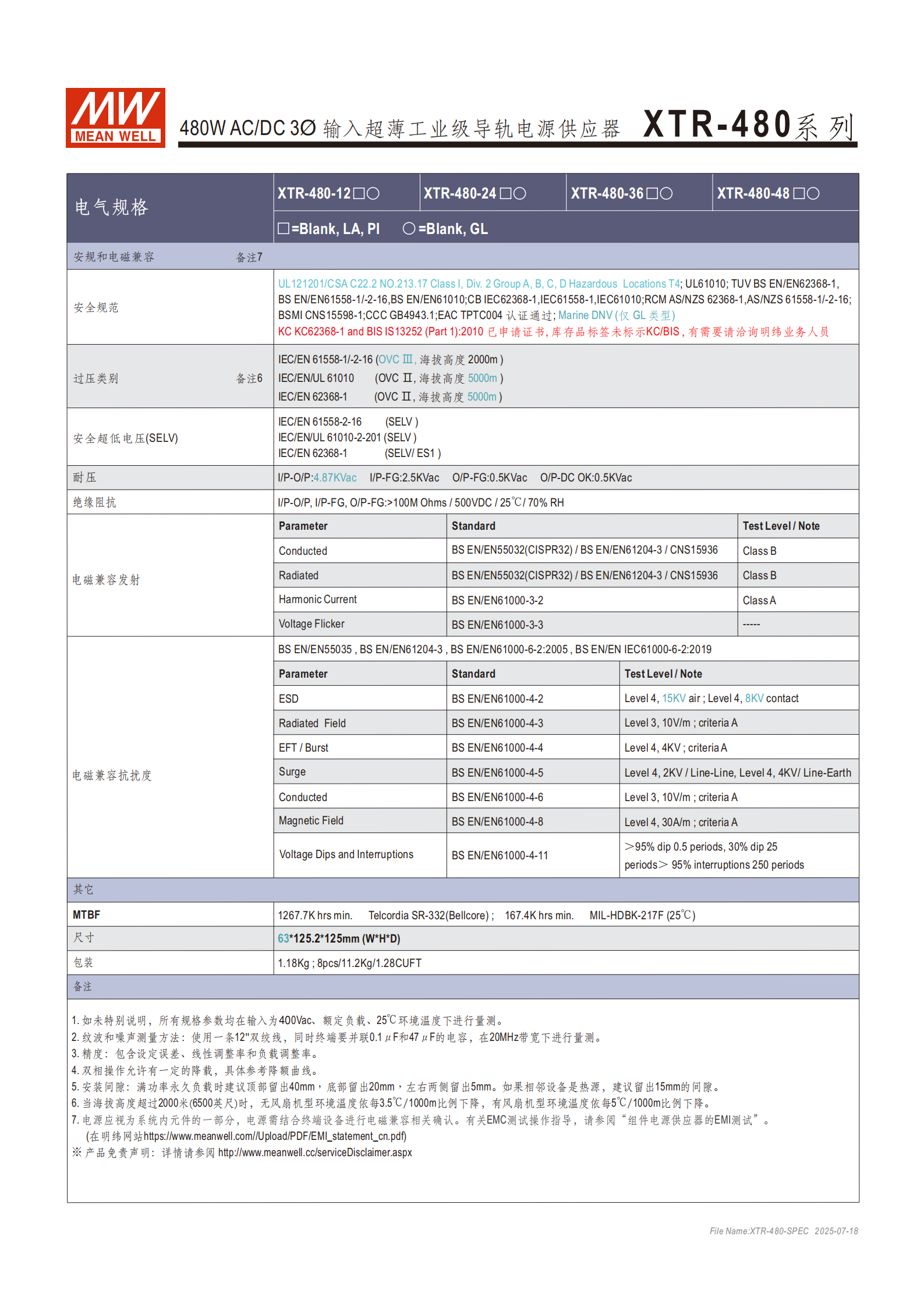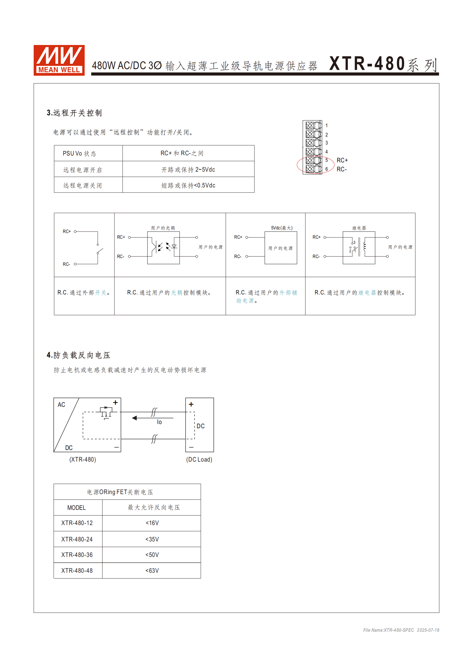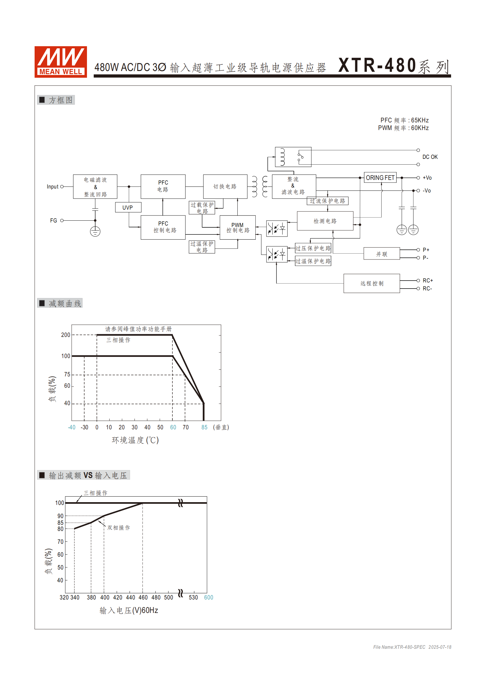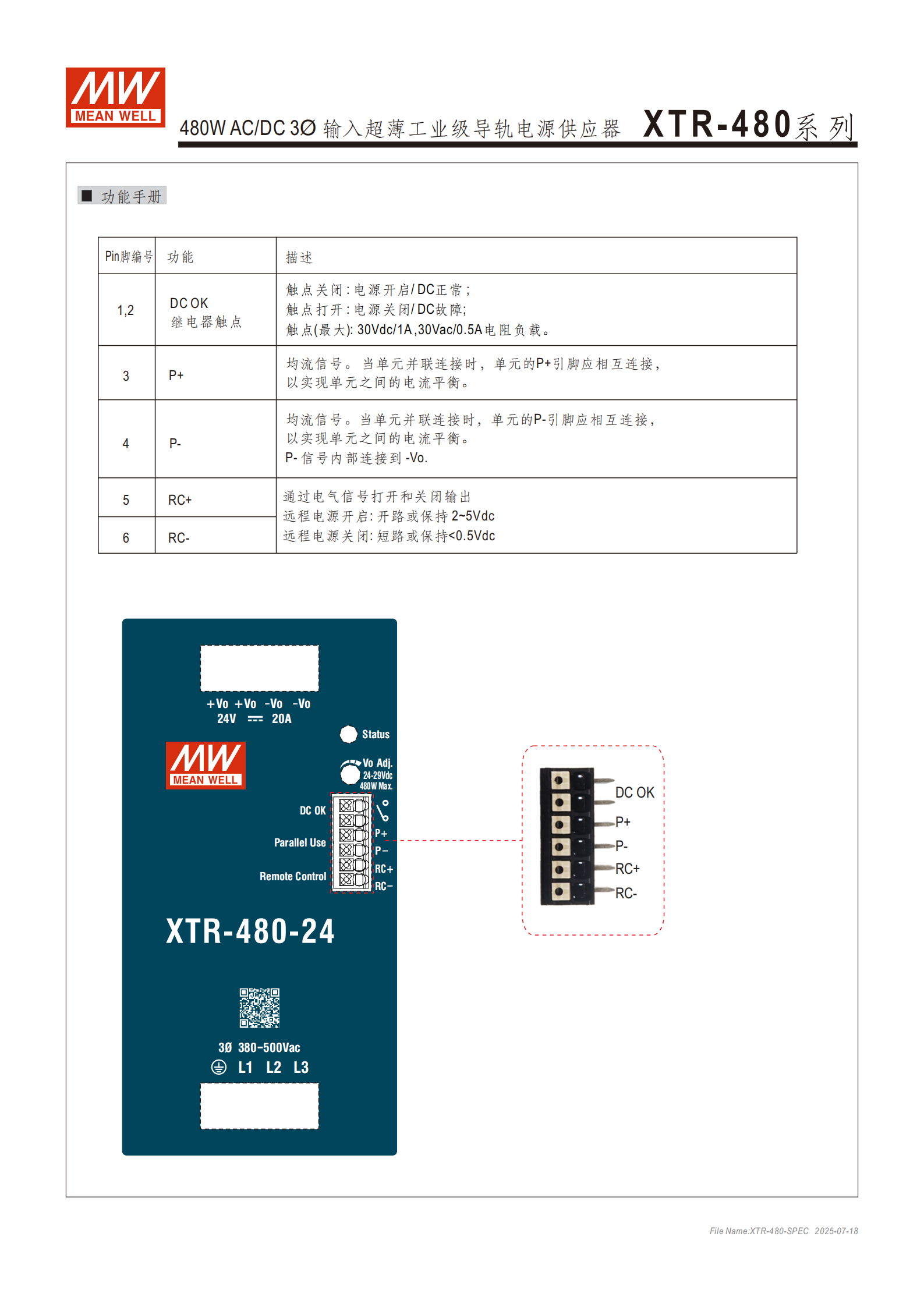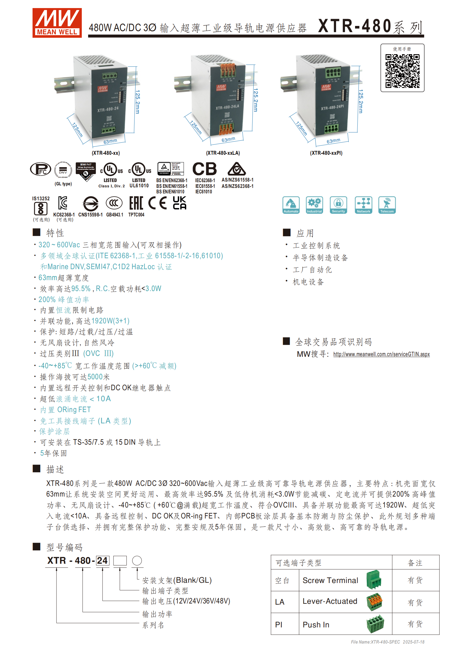 XTR-480 系列是480W AC/DC ,輸入電壓范圍 320~600Vac(可雙相操作),機(jī)殼寬度僅63mm,效率高達(dá)95.5% 、空載功耗 < 3.0W,具備 **-40~+85℃** 寬工作溫度范圍(+60℃滿載),支持200% 峰值功率、最高1920W(3+1)并聯(lián)功能,內(nèi)置恒流限制、ORing FET 等電路及短路 / 過(guò)載 / 過(guò)壓 / 過(guò)溫保護(hù),擁有免工具接線端子(LA 類型)、遠(yuǎn)程開關(guān)控制等特性,通過(guò)多國(guó)安規(guī)認(rèn)證,適用于工業(yè)控制系統(tǒng)、半導(dǎo)體制造設(shè)備等場(chǎng)景,提供5 年保固。