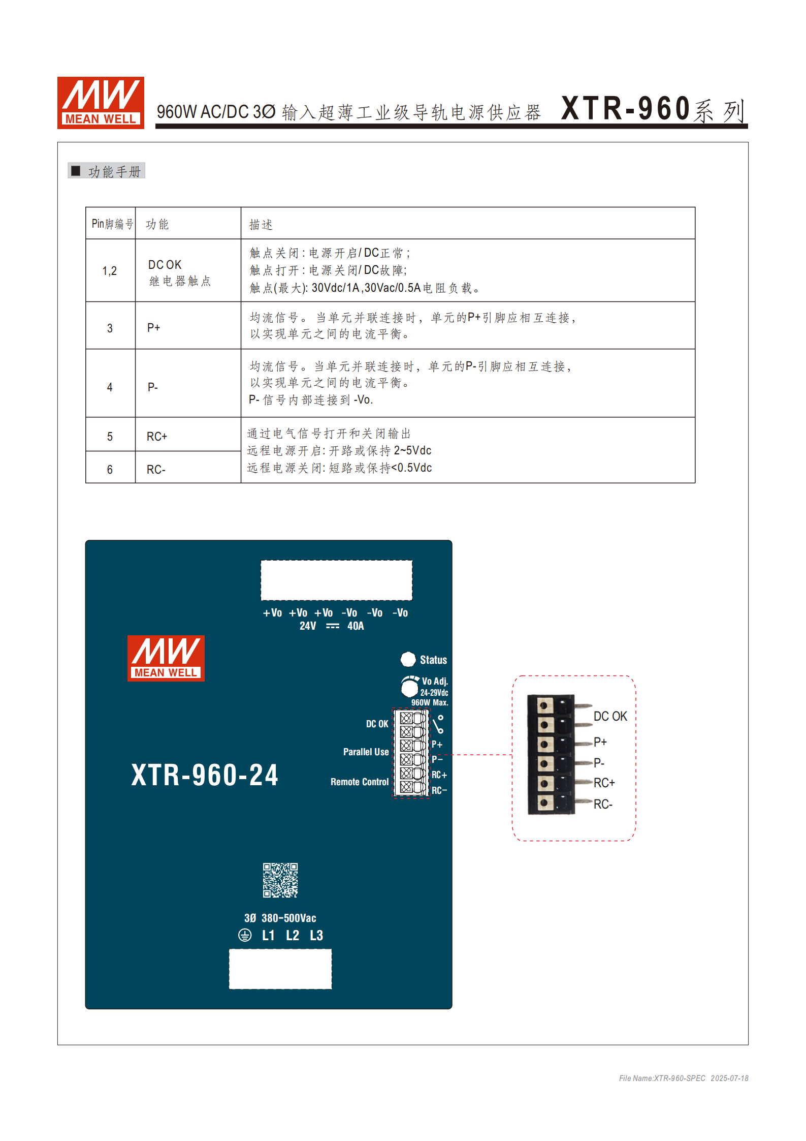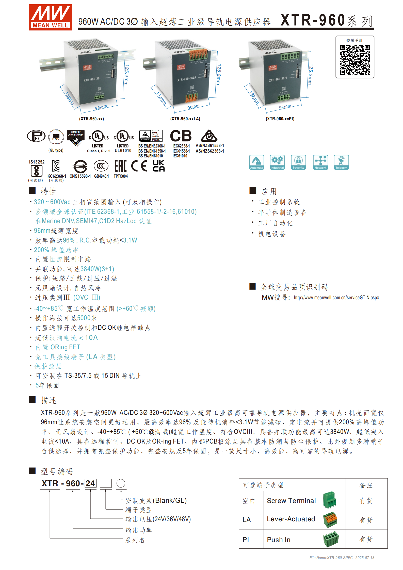 XTR-960 系列是960W AC/DC 三相輸入超薄工業(yè)級導軌電源供應器,輸入電壓范圍 320~600Vac(可雙相操作),輸出電壓涵蓋 24V、36V、48V,具備96mm 超薄寬度、96% 最高效率、<3.1W 空載功耗、-40~+85℃寬工作溫度等核心優(yōu)勢,支持200% 峰值功率、3840W(3+1)并聯(lián)輸出,內置恒流限制、ORing FET 及短路 / 過載 / 過壓 / 過溫等多重保護,通過全球多領域安規(guī)認證,適配工業(yè)控制系統(tǒng)、半導體制造設備等場景,提供 5 年保固。