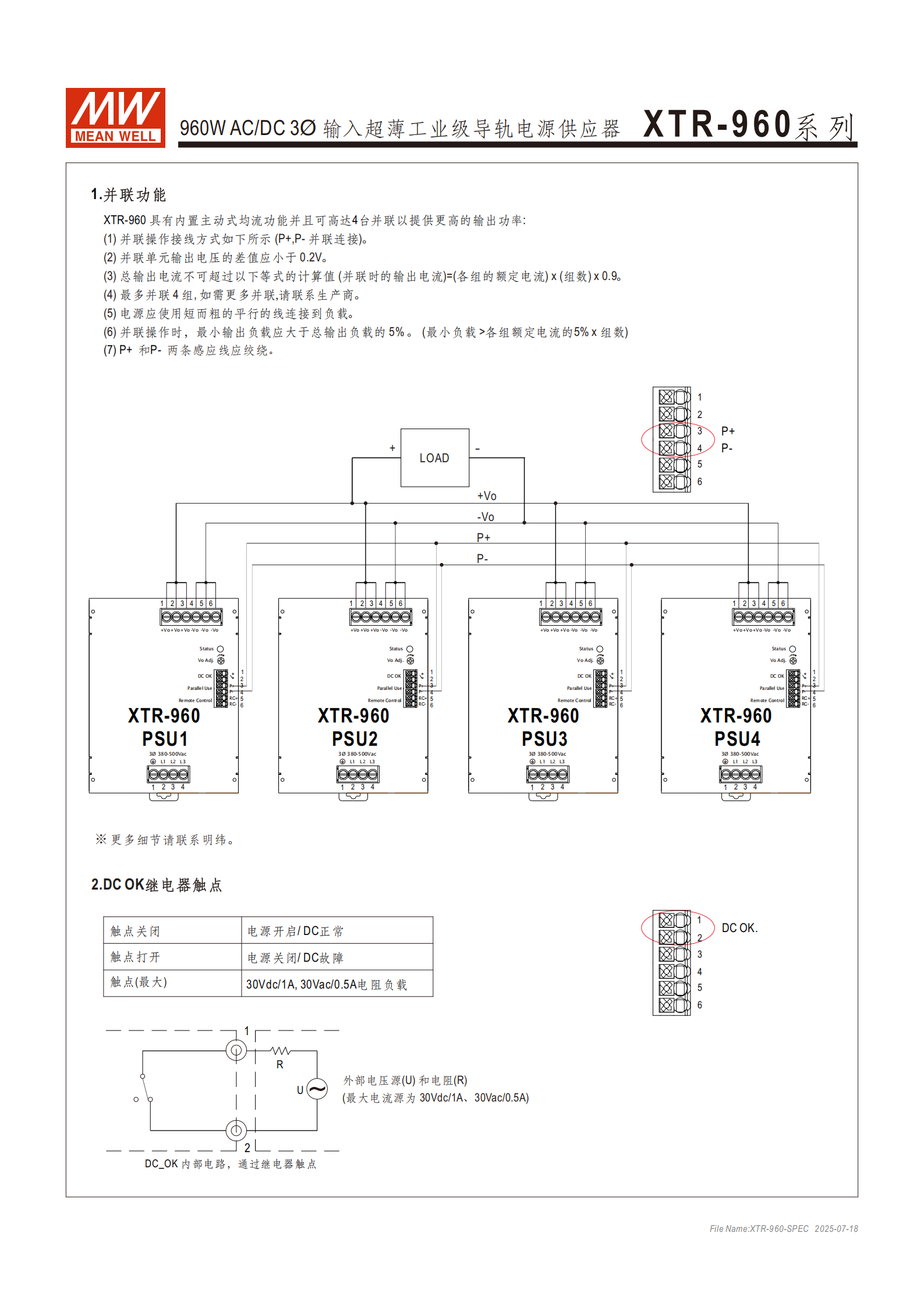 擴展功能:支持 3+1 并聯(lián),最大輸出功率 3840W,需通過 P+、P - 引腳實現(xiàn)均流;配備遠程開關控制(RC+、RC - 引腳)、DC OK 繼電器觸點(最大 30Vdc/1A、30Vac/0.5A 電阻負載)。