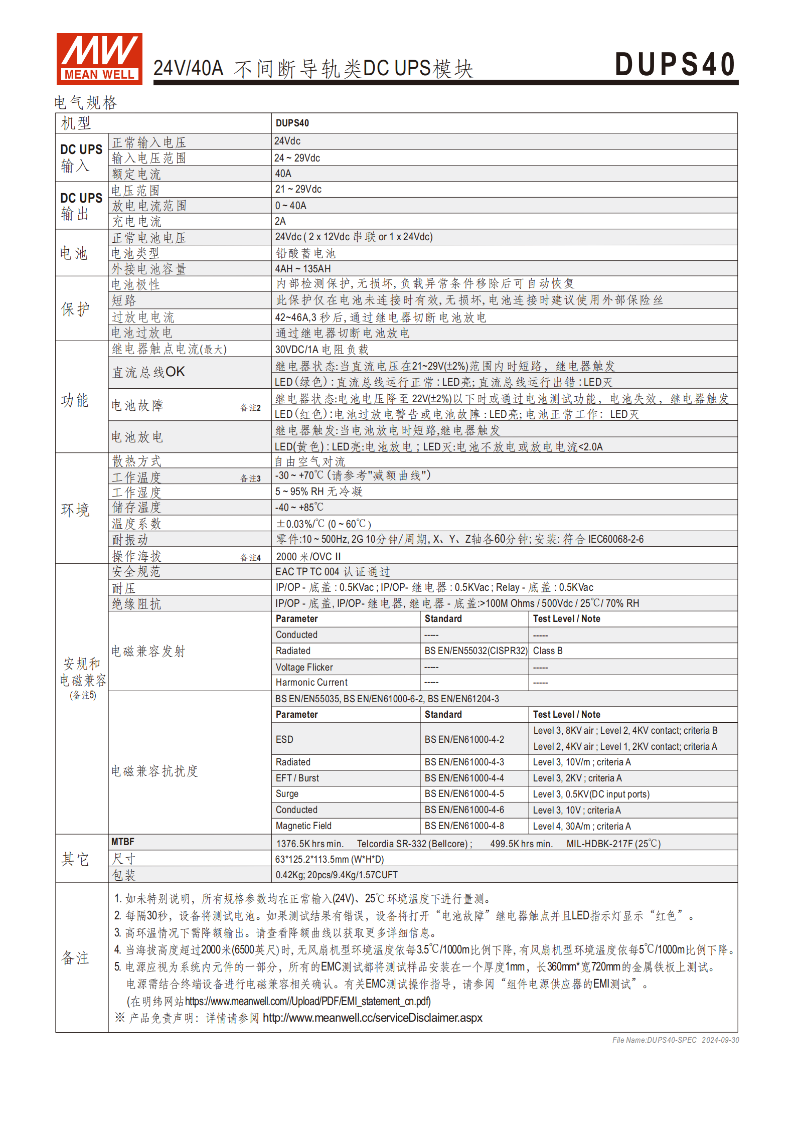 產(chǎn)品類型:24V/40A 不間斷導軌類 DC UPS 模塊