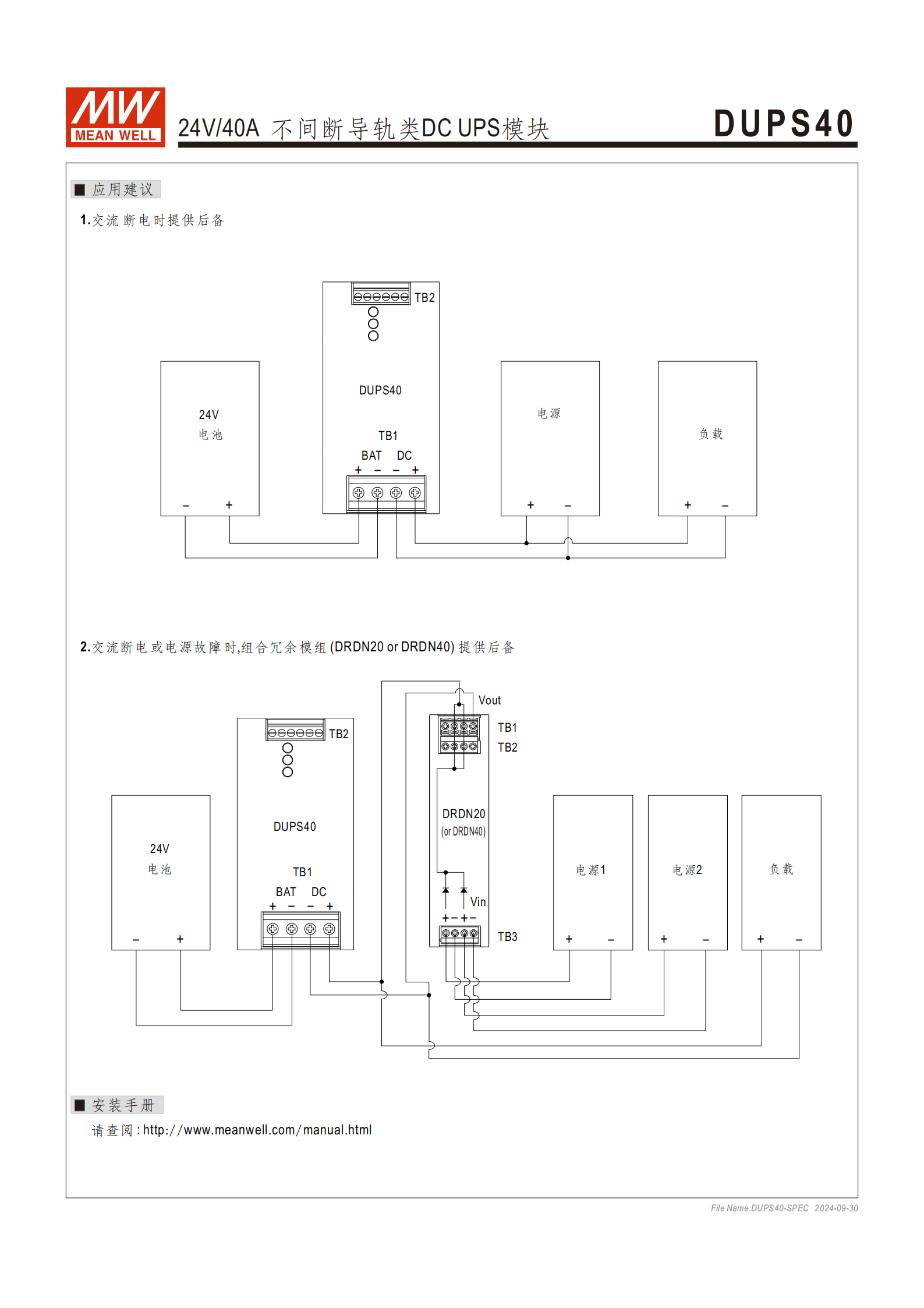 方案 2:與冗余模組(DRDN20/DRDN40)組合,交流斷電或電源故障時提供后備