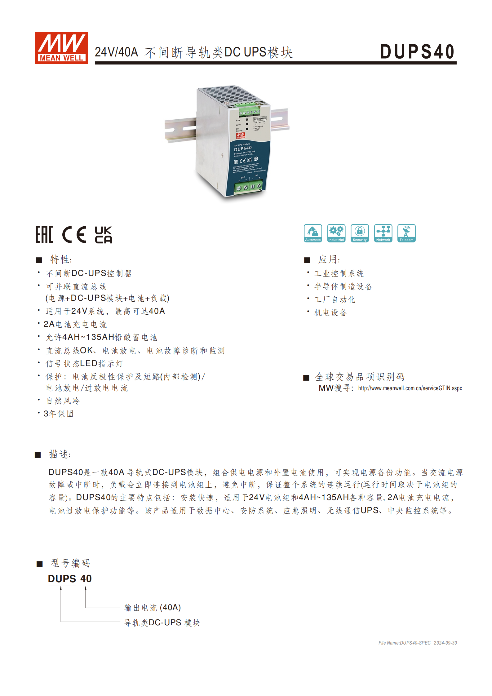 DUPS40 是一款 24V/40A 導軌式 DC-UPS 模塊,需搭配 4AH~135AH 鉛酸蓄電池 使用,具備 2A 充電電流 及電池反極性、短路、過放電等多重保護,通過 LED 指示燈監(jiān)測工作狀態(tài),采用自然風冷散熱,工作溫度范圍 -30~+70℃,適用于工業(yè)控制系統(tǒng)、數(shù)據(jù)中心、安防系統(tǒng)等場景,可在交流電源故障時快速切換至電池供電,保障系統(tǒng)連續(xù)運行,提供 3 年保固。