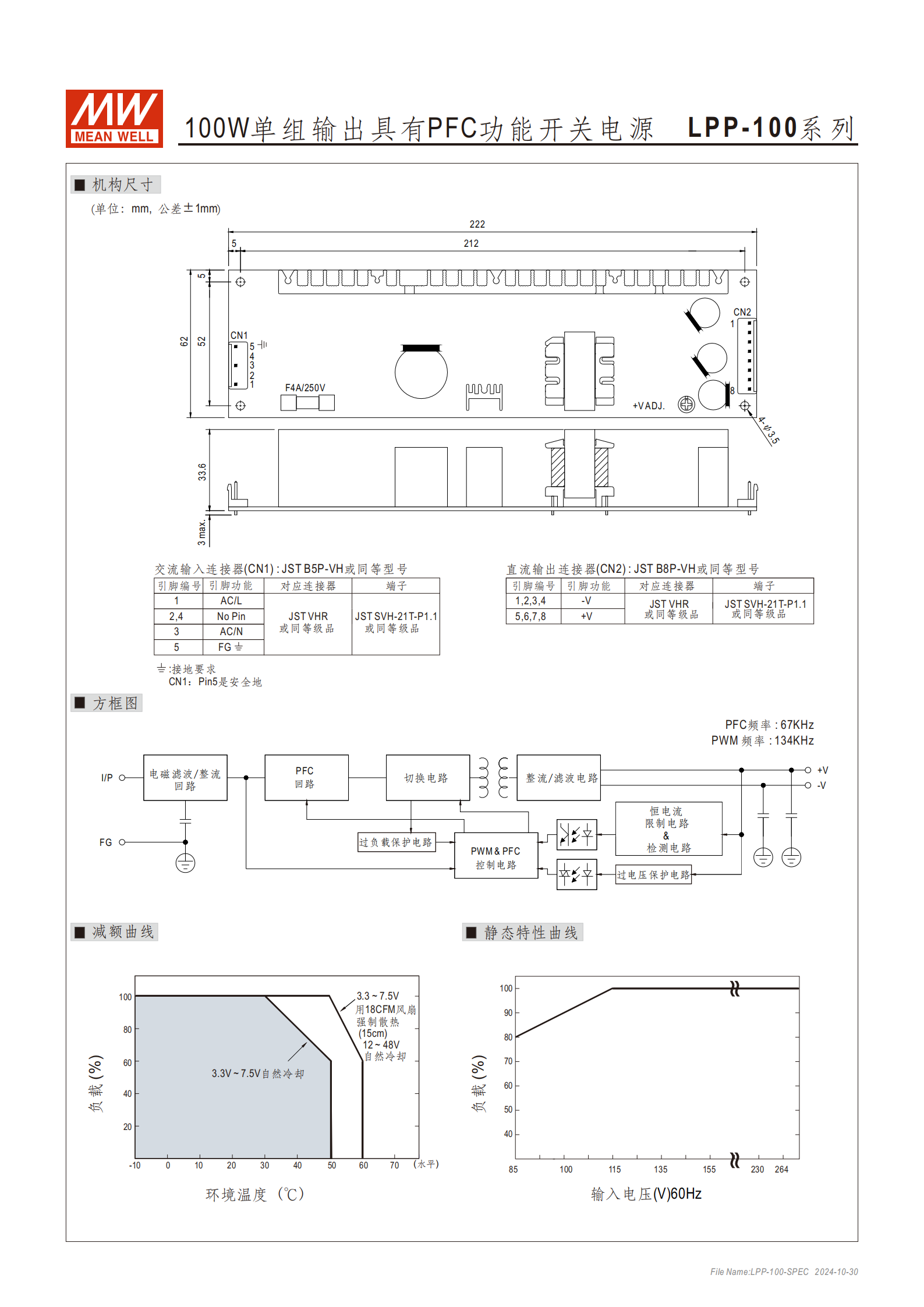 | LPP-100-48 | 48V | 2.1A | 100.8W | ±1.0% | 250mVp-p | 45.6~52.8V |
