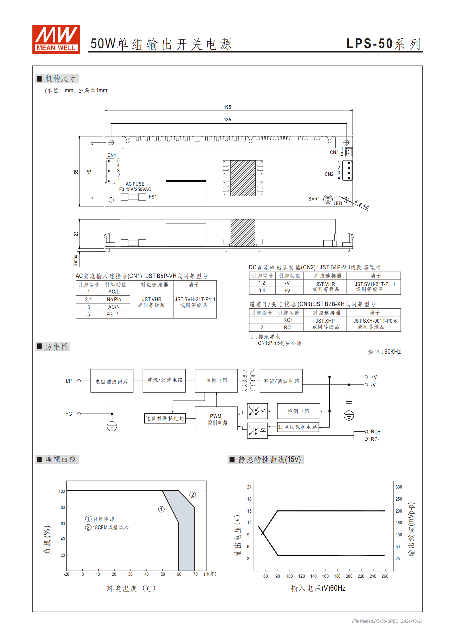 連接器名稱 型號(hào) 引腳功能 對(duì)應(yīng)端子 直流輸出(CN2) JST B4P-VH 或同等 1,2 腳:-V;3,4 腳:+V JST VHR 或同等;JST SVH-21T-P1.1 或同等 交流輸入(CN1) JST B5P-VH 或同等 5 腳:安全地 - 遙控開 / 關(guān)(CN3) JST B2B-XH 或同等 1 腳:RC+;2 腳:RC- JST XHP 或同等;JST SXH-001T-P0.6 或同等 遙控功能:RC+/RC- 輸入 0~0.8V 時(shí)電源啟動(dòng),4~10V 時(shí)電源關(guān)閉