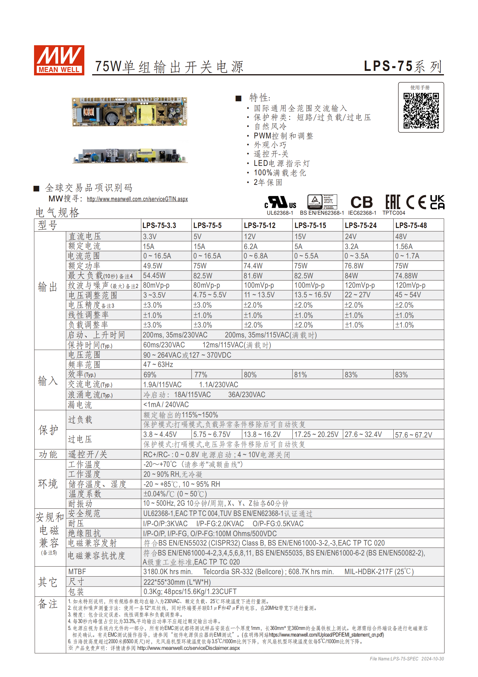 LPS-75 系列是75W 單組輸出開關(guān)電源,具備國(guó)際通用全范圍交流 / 直流輸入(90~264VAC 或 127~370VDC),提供 3.3V、5V、12V 等 6 種輸出規(guī)格,核心特性包括PWM 控制、遙控開關(guān)、多重保護(hù)(短路 / 過(guò)負(fù)載 / 過(guò)電壓)、自然風(fēng)冷,通過(guò) UL62368-1 等多項(xiàng)安規(guī)認(rèn)證,尺寸 2225530mm,支持2 年保固,適用于多種工業(yè)及電子設(shè)備場(chǎng)景。