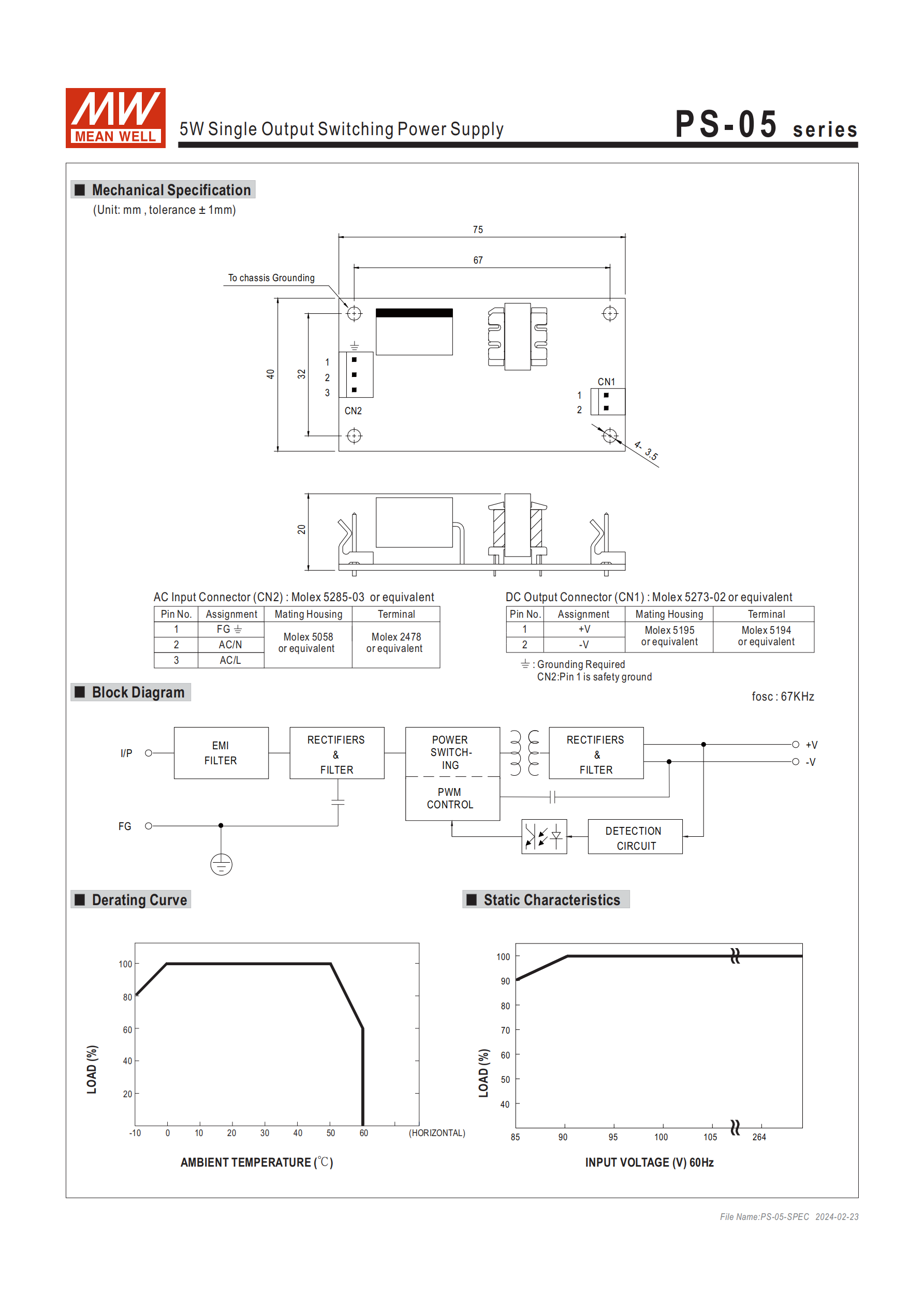 | PS-05-5 | 5V | 1A | 0~1.2A | 5W | 100mVp-p | ±2.0% |