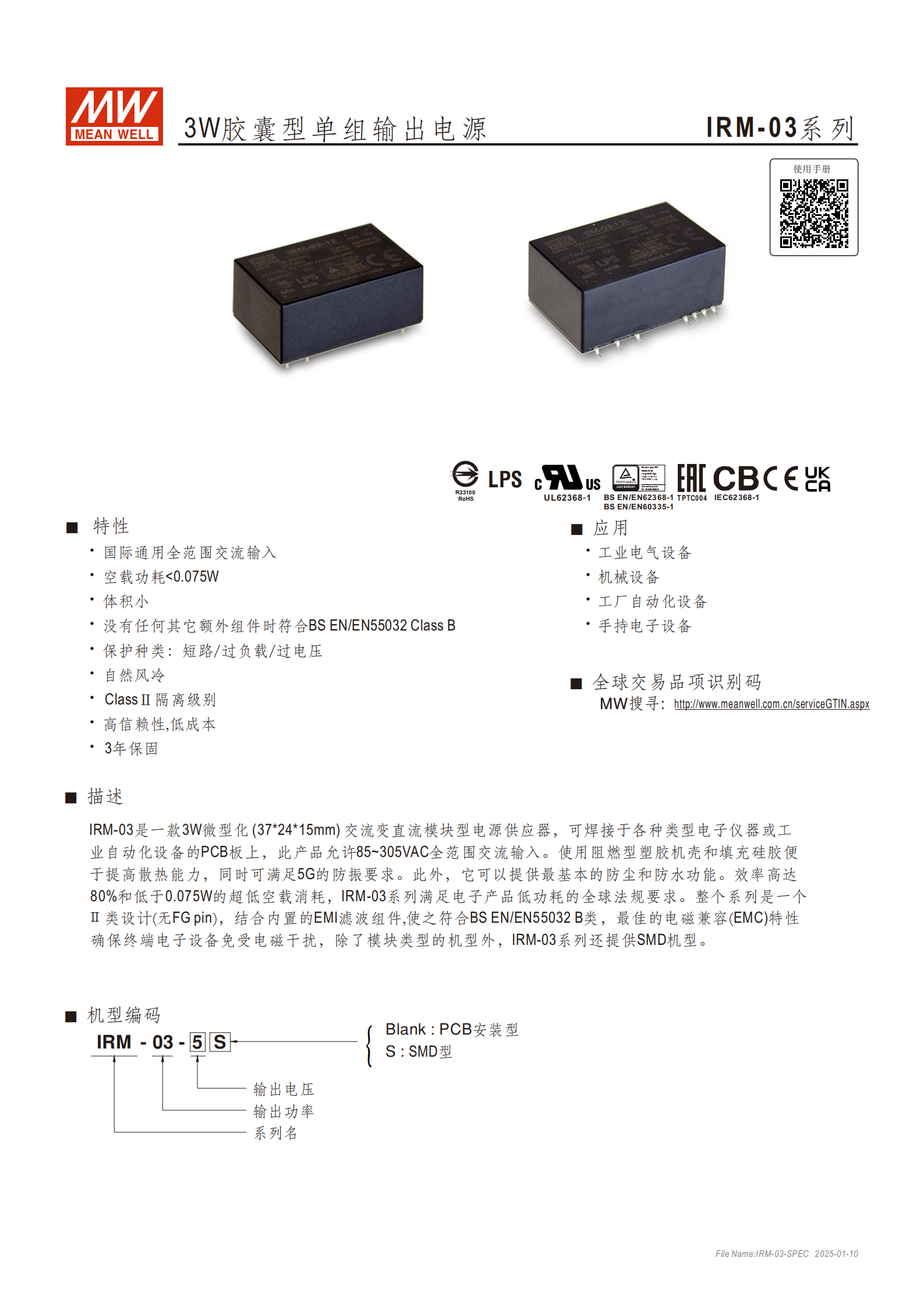 IRM-03 系列是 3W 膠囊型單組輸出 AC-DC 模塊電源,具備85~305VAC 全范圍交流輸入、≤0.075W 超低空載功耗、80% 最高效率,提供 3.3V~24V 多種輸出電壓選項(xiàng),采用阻燃塑膠機(jī)殼 + 硅膠填充設(shè)計(jì),滿足 5G 防振及基礎(chǔ)防塵防水需求,符合 ClassⅡ 隔離級別與 BS EN/EN55032 Class B 電磁兼容標(biāo)準(zhǔn),具備短路 / 過負(fù)載 / 過電壓保護(hù)功能,有 PCB 安裝型(372415mm)和 SMD 型(372416mm)兩種機(jī)型,適用于工業(yè)電氣、機(jī)械設(shè)備等場景,提供 3 年保固,信賴性高且成本低。