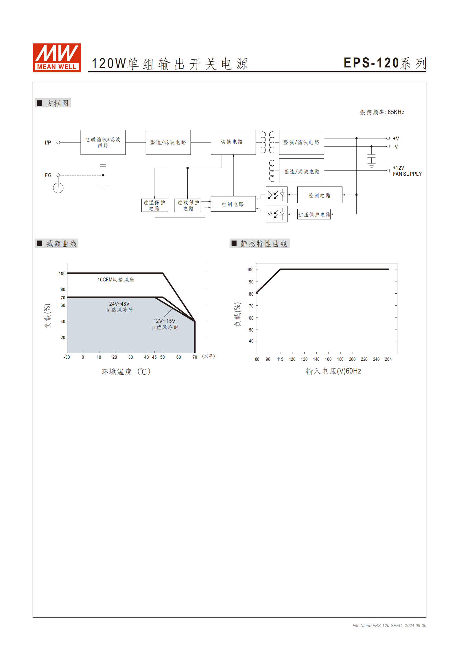 | 輸出特性(分型號(hào)) | 型號(hào) - 輸出電壓 - 自然風(fēng)冷電流 - 風(fēng)扇風(fēng)冷電流 - 自然風(fēng)冷功率 - 風(fēng)扇風(fēng)冷功率 - 紋波噪聲(最大) | EPS-120-12:12V、7.0A、8A、84W、120W、120mVp-pEPS-120-15:15V、5.6A、8A、84W、120W、120mVp-pEPS-120-24:24V、3.5A、5A、84W、120W、150mVp-pEPS-120-27:27V、3.15A、4.5A、85W、121.5W、150mVp-pEPS-120-48:48V、1.75A、2.5A、84W、120W、200mVp-p |