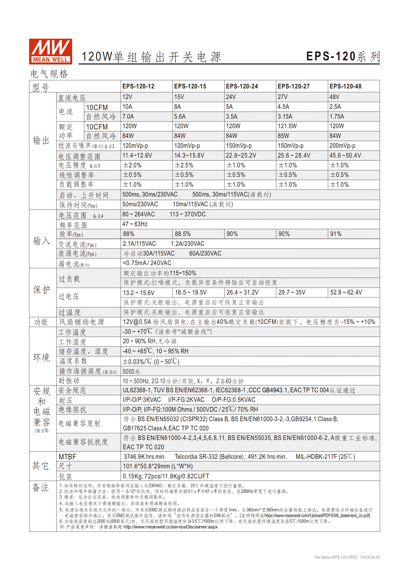 EPS-120 系列是一款 120W 單組輸出基板型工業(yè)用開關(guān)電源,采用 4"×2" 小巧封裝,輸入電壓范圍 80~264VAC(兼容 113~370VDC),輸出電壓涵蓋 12V、15V、24V、27V、48V 等規(guī)格,自然風(fēng)冷下額定功率 84W、10CFM 風(fēng)扇風(fēng)冷時達(dá) 120W,效率最高 91%,空載功耗 < 0.3W,具備短路 / 過負(fù)載 / 過電壓 / 過溫度完整保護(hù)功能,符合 UL62368-1 等多項國際安全與 EMC B 級標(biāo)準(zhǔn),可在海拔 5000 米、-30~+70°C 環(huán)境下工作,內(nèi)置 12V/0.5A 風(fēng)扇輔助電源,提供 3 年保固,適用于工業(yè)電子設(shè)備、控制系統(tǒng)等多種場景。