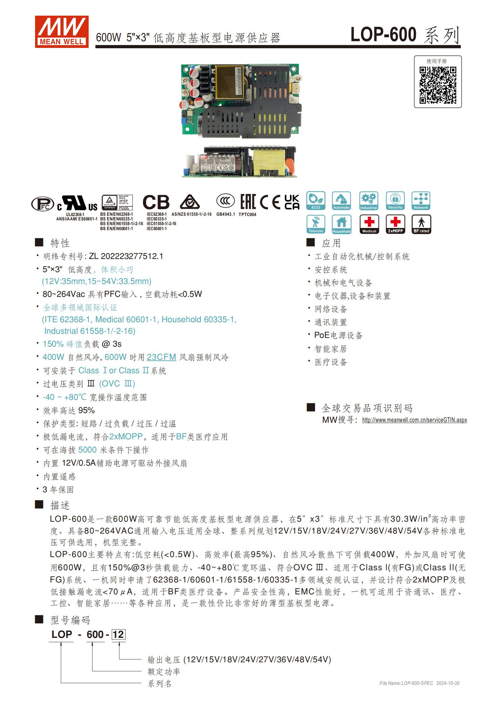 LOP-600 系列是一款 600W 5"×3" 低高度基板型電源供應器,具備80~264VAC 通用輸入電壓、-40~+80℃寬工作溫度范圍,效率高達95% ,空載功耗 < 0.5W,自然風冷下最大輸出功率 360W(12V 機型)/400W(15~54V 機型),外接風扇時可達 600W,支持 150%×3 秒峰值負載,通過IEC62368-1、IEC60601-1 等多領域國際認證,符合 2xMOPP 標準及超低漏電流要求,適用于醫(yī)療設備、工業(yè)自動化、通訊裝置等多場景,提供 3 年保固。