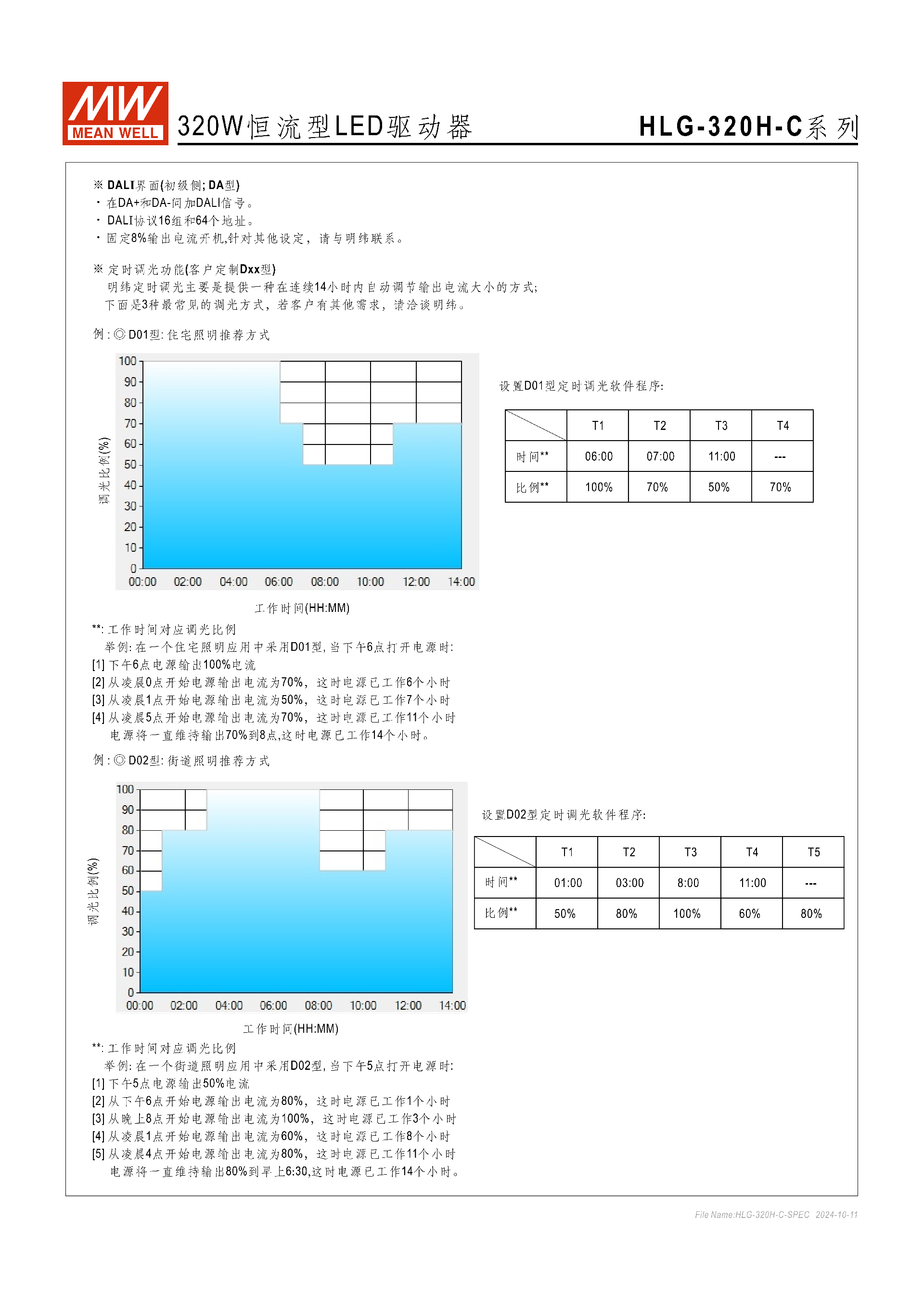 標(biāo)配模式:D01(住宅照明)、D02(街道照明)、D03(隧道照明),各模式按工作時(shí)長(zhǎng)階梯式調(diào)整調(diào)光比例。