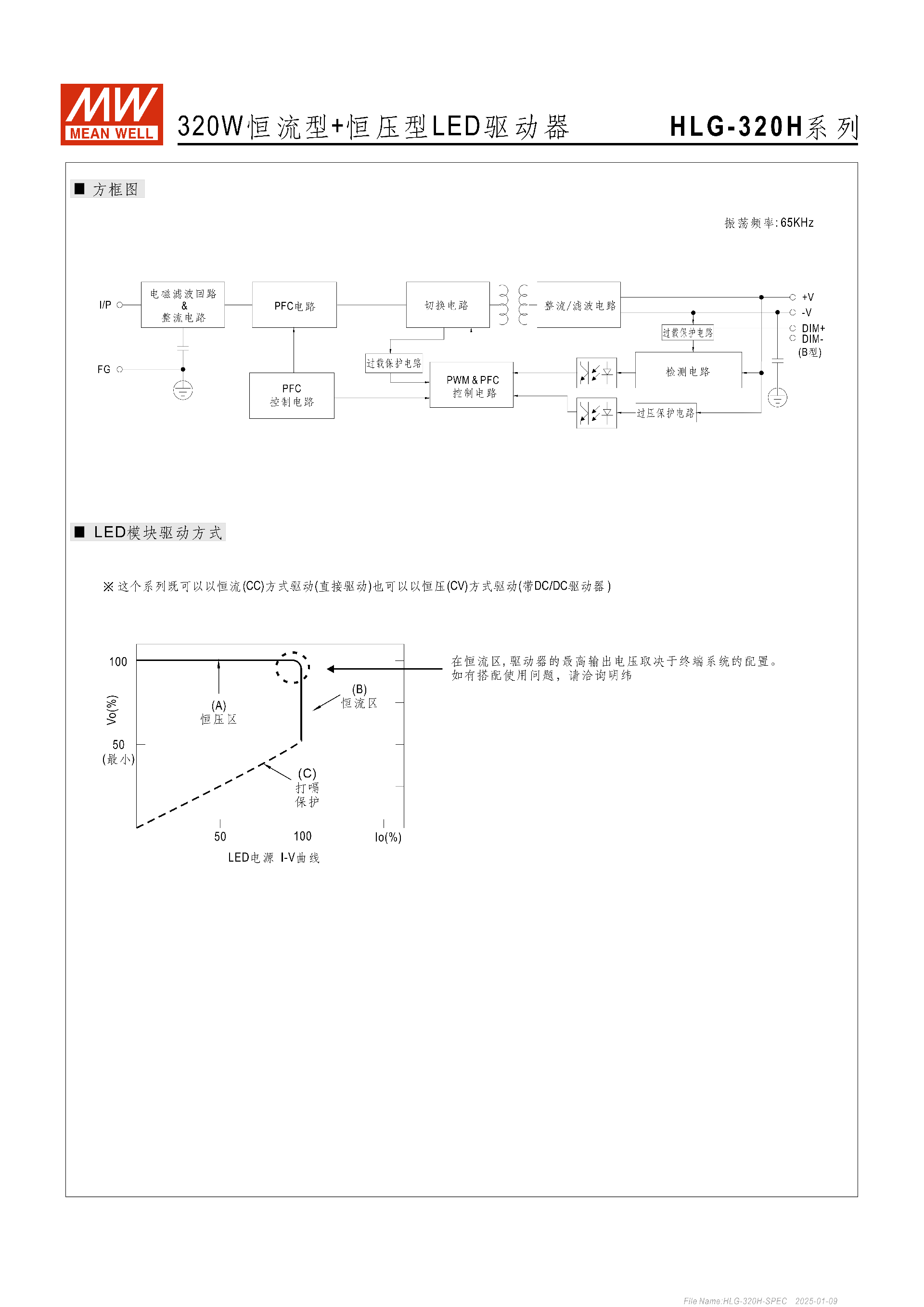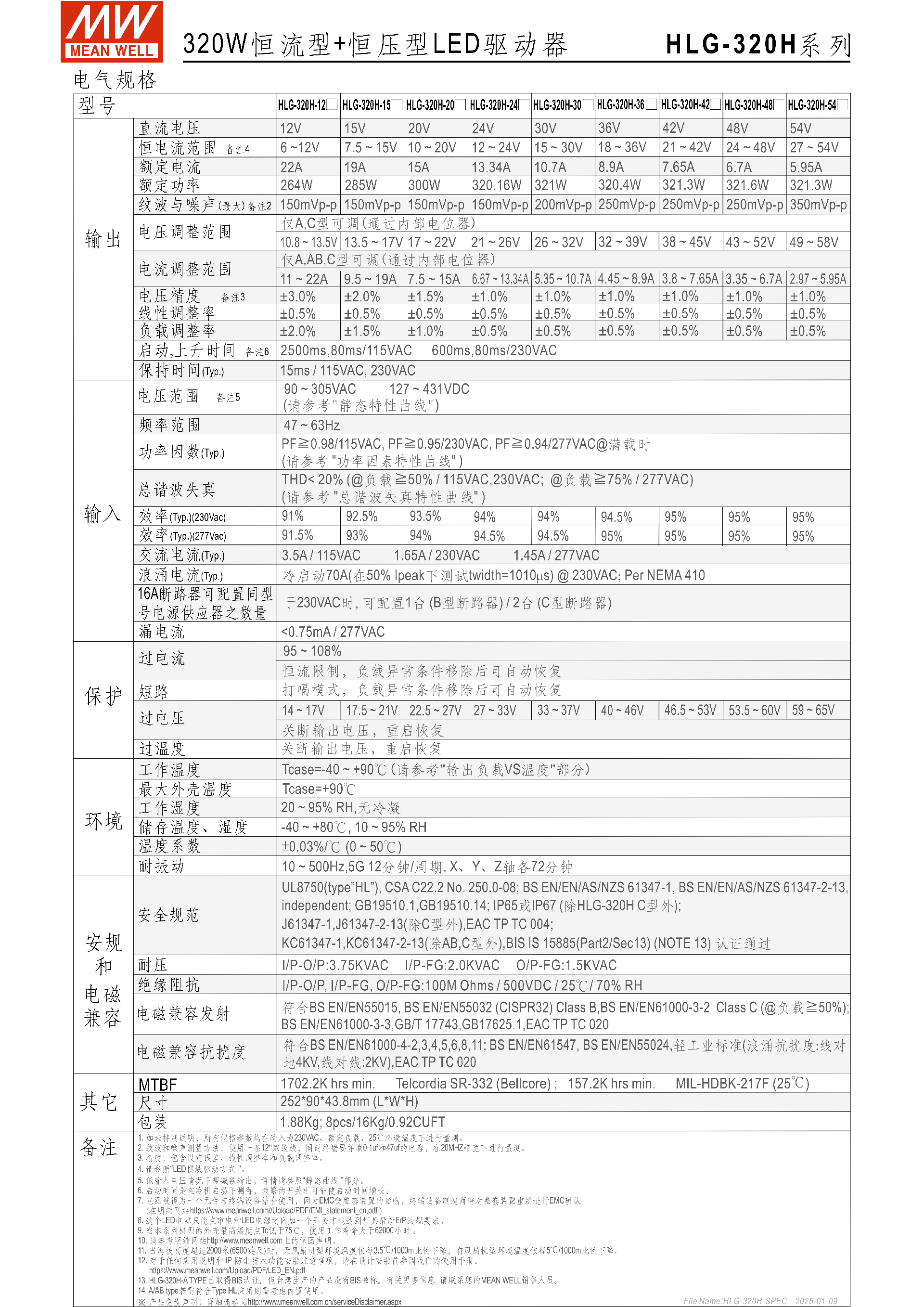 明緯HLG-320H 系列是 320W 恒流 + 恒壓型 LED 驅(qū)動器,輸入電壓覆蓋90~305VAC,輸出額定電壓為12V~54V多檔位,具備IP65/IP67防護(hù)等級,轉(zhuǎn)換效率最高達(dá)94.5%,工作溫度為 **-40℃~+90℃機殼溫度,擁有恒流 / 恒壓雙驅(qū)動模式,提供 Blank/A/B/AB/C/D 六種功能型號,支持三合一調(diào)光(B/AB 型)、電壓 / 電流內(nèi)部電位器調(diào)節(jié)(A/AB/C 型)等功能,內(nèi)置主動式 PFC,防護(hù)功能完善,壽命超62000 小時且提供7 年保固 **,適用于街道、高架、停車場等多種戶內(nèi)外 LED 照明場景。