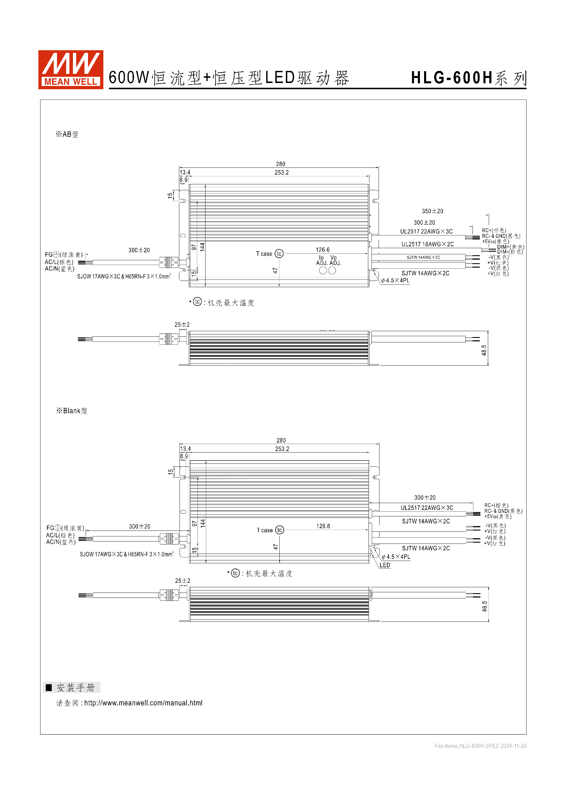示例:HLG-600H-24A → 600W/24V 輸出 / A 型功能(IP65 + 電位器調(diào)節(jié));HLG-600H-48B → 600W/48V 輸出 / B 型功能(IP67 + 三合一調(diào)光)。