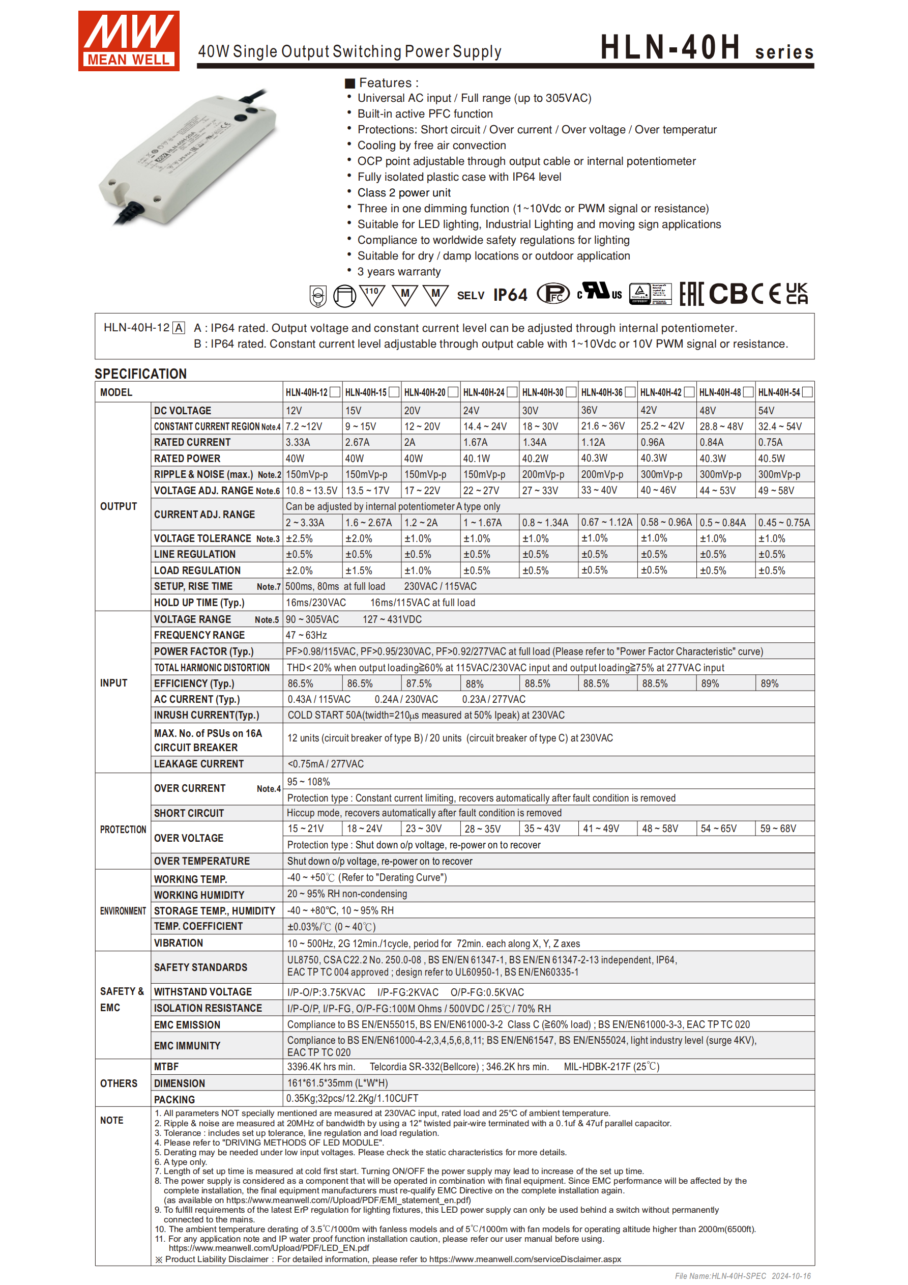| HLN-40H-48 | 48V | 0.84A | 40.3W | 300mVp-p | 0.5~0.84A |