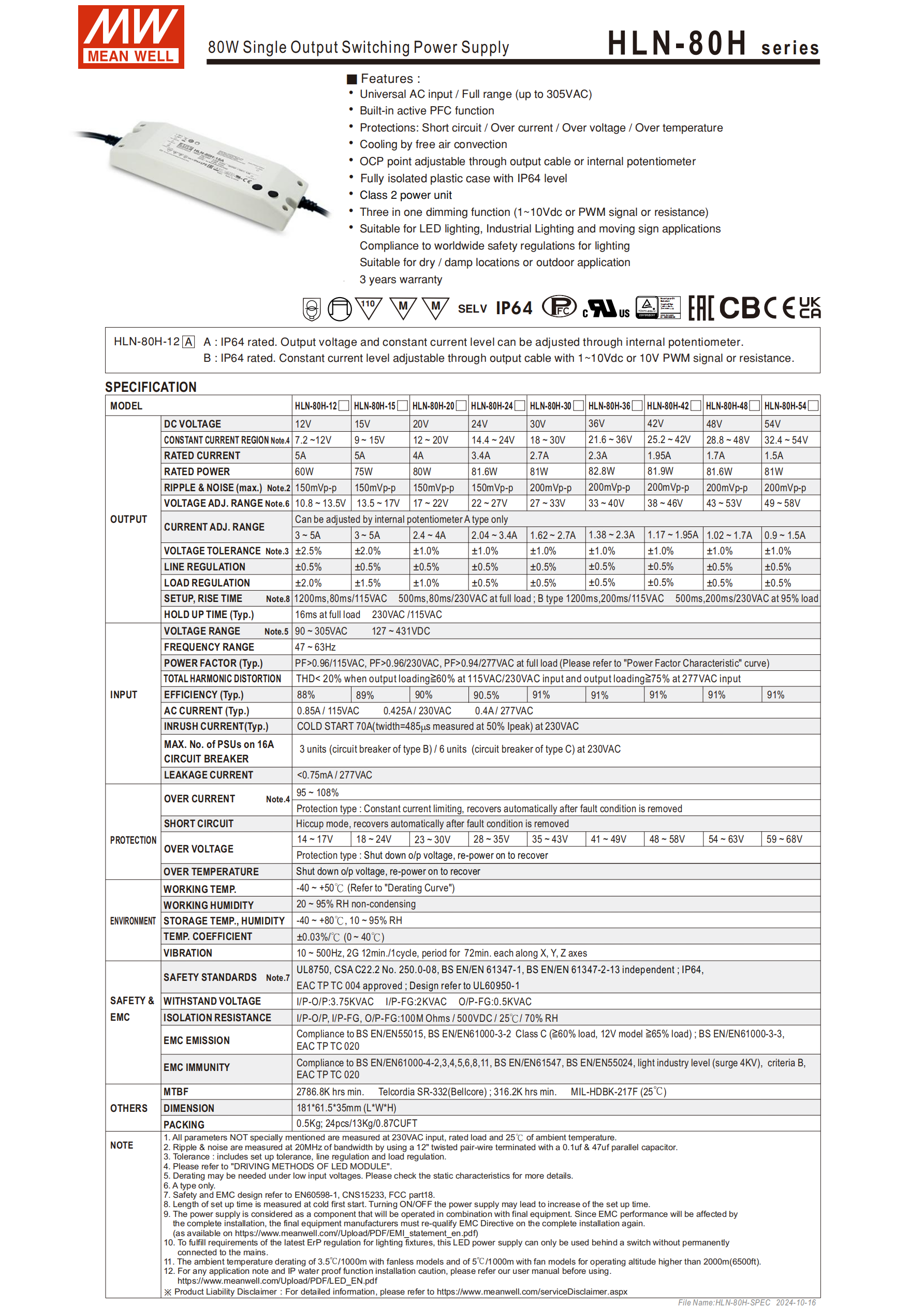 | HLN-80H-24 | 24 | 2.04~3.4 | 81.6 | 150 | ±1.0% | 90.5% |