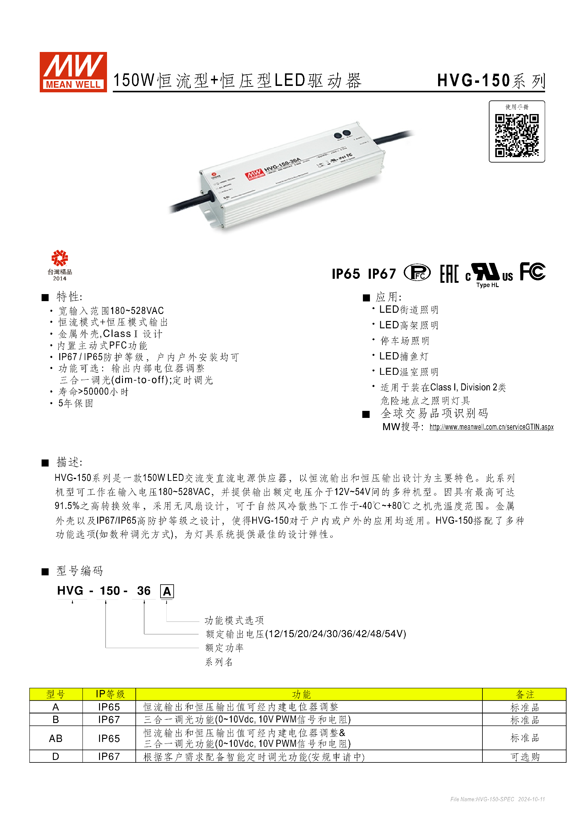 明緯HVG-150 系列是 150W 恒流 + 恒壓型 LED 驅(qū)動(dòng)器,具備180~528VAC 寬輸入電壓,輸出額定電壓覆蓋 12V~54V 多檔位,擁有IP65/IP67 高防護(hù)等級(jí),金屬外殼無(wú)風(fēng)扇設(shè)計(jì)可在 - 40℃~+80℃機(jī)殼溫度工作,轉(zhuǎn)換效率最高達(dá)91.5%;該系列分 A/B/AB/D 四種功能型號(hào),支持內(nèi)部電位器調(diào)節(jié)、三合一調(diào)光(0~10Vdc/10V PWM / 電阻)等功能,部分型號(hào)可選智能定時(shí)調(diào)光,內(nèi)置主動(dòng)式 PFC,防護(hù)功能完善,MTBF 壽命優(yōu)異,適配 LED 街道、高架、溫室等多種照明場(chǎng)景,還可用于 Class I, Division 2 類危險(xiǎn)地點(diǎn)照明,提供5 年保固,物理尺寸為 2456838.8mm,支持戶內(nèi)戶外安裝及多種防水接頭、接線配件選配。