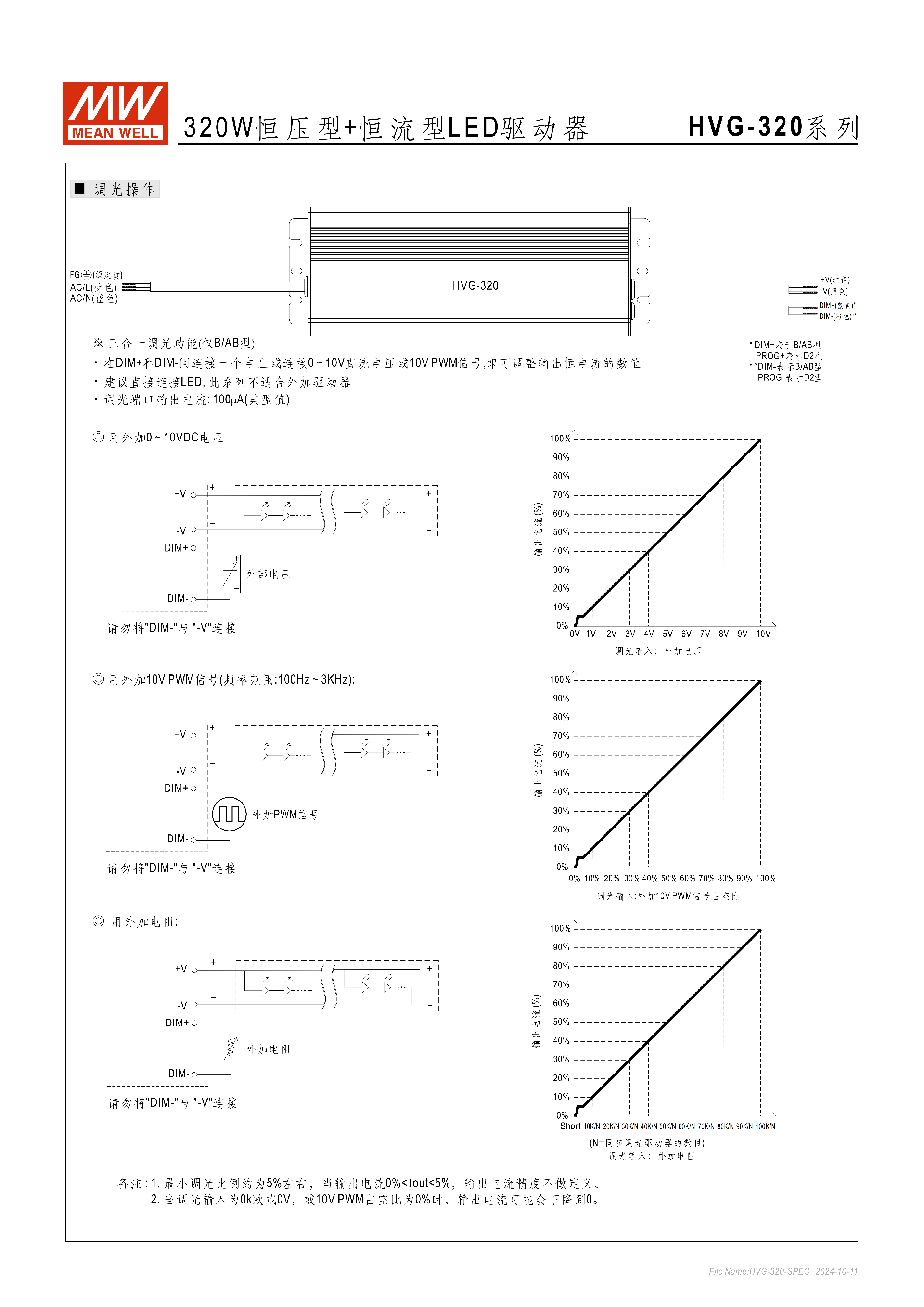 三合一調光(B/AB 型):調光端口輸出電流典型值100μA,通過 DIM+/DIM - 端口連接 0~10Vdc 電壓、10V PWM 信號(100Hz~3KHz)或電阻實現調光,最小調光比例約 5%,0V/0 歐 / 0% 占空比時輸出電流可降至 0;