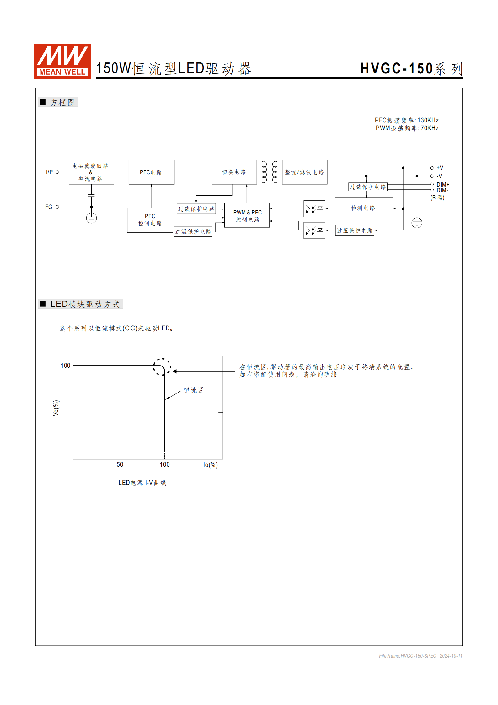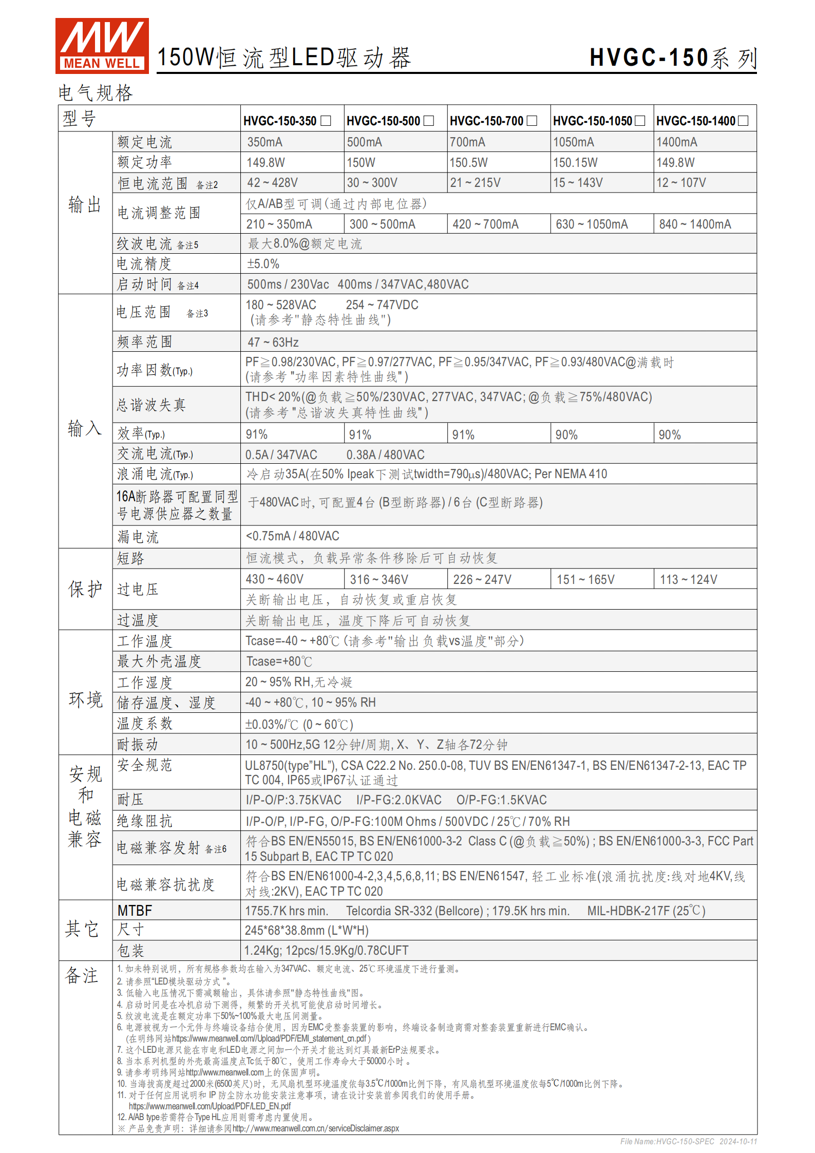 明緯 HVGC-150 系列是 150W 恒流型 LED 驅(qū)動器,具備180~528VAC 寬輸入電壓范圍,額定輸出電流覆蓋350mA~1400mA五檔,擁有IP65/IP67 高防護(hù)等級與金屬外殼,內(nèi)置主動式 PFC 功能,轉(zhuǎn)換效率最高達(dá)91%,支持電位器調(diào)流、三合一調(diào)光(0~10Vdc/10V PWM / 電阻)、定時調(diào)光等可選功能,工作溫度為 **-40℃~+80℃,MTBF 值最低 179.5K hrs,壽命超50000 小時 **,提供 5 年保固,適配 LED 街道、高架、停車場、捕魚燈等照明場景,還可用于 Class I, Division 2 類危險地點照明。