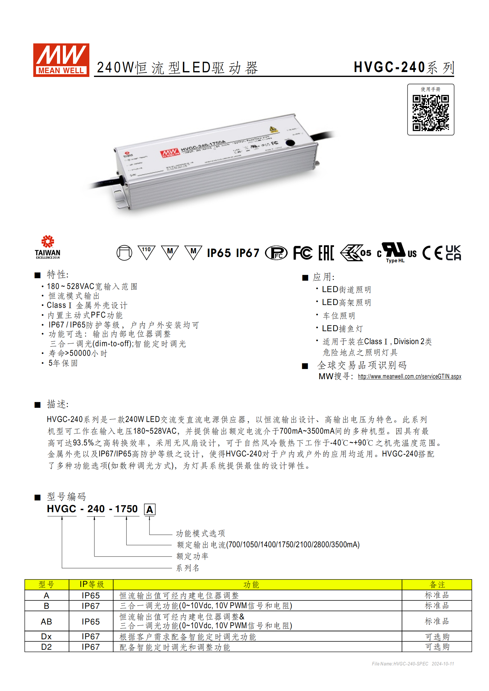 型號編碼規(guī)則為HVGC-240 - 額定輸出電流 - 功能模式,額定輸出電流涵蓋 700/1050/1400/1750/2100/2800/3500mA 共 7 款,功能模式分標準品與選購品,具體參數(shù)如下: