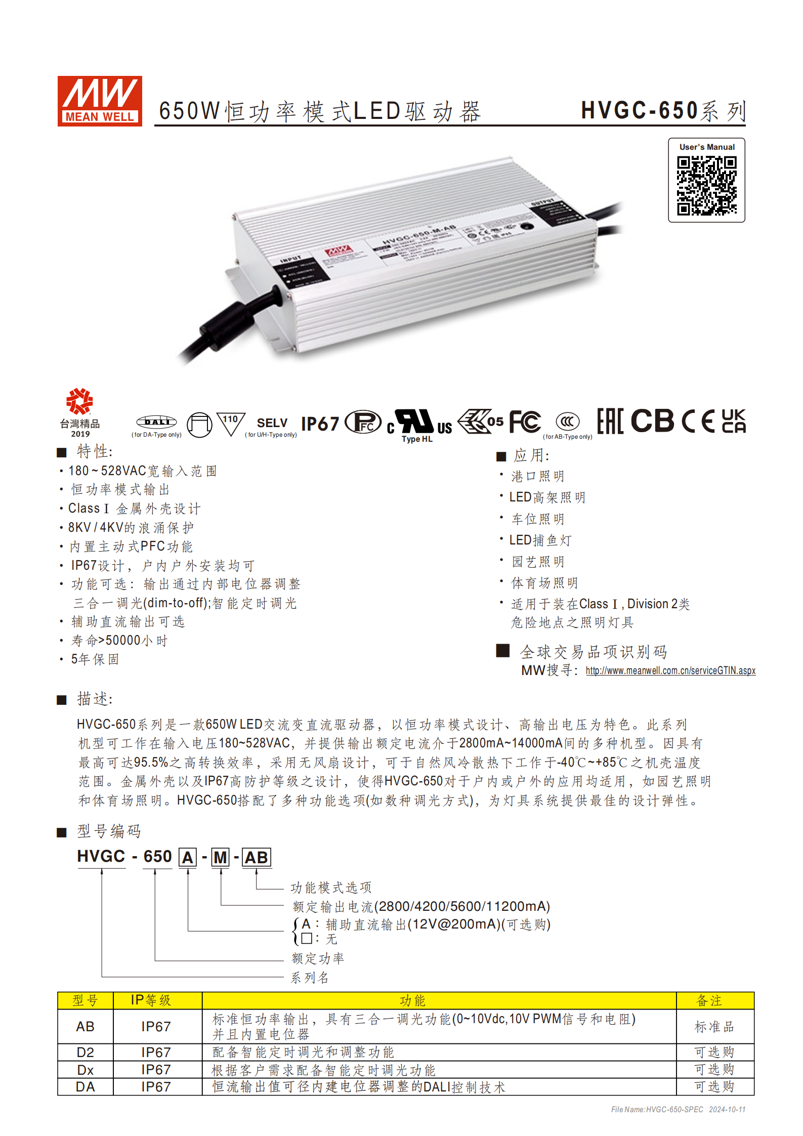 編碼規(guī)則:HVGC-1000-【額定電流】-【功能模式】,其中額定電流 L=2800mA、M=4200mA、H=5600mA;功能模式分 4 類,均為 IP67 等級,具體如下:| 功能模式 | 核心功能 | 產(chǎn)品屬性 ||----------|----------|----------|| AB | 標(biāo)準(zhǔn)恒功率 + 三合一調(diào)光(0~10Vdc/10VPWM / 電阻)+ 內(nèi)置電位器 | 標(biāo)準(zhǔn)品 || D2 | 智能定時(shí)調(diào)光 | 可選購 || Dx | 客戶定制化智能定時(shí)調(diào)光 | 可選購 || DA | DALI-2 控制 + 恒流輸出 + 內(nèi)置電位器調(diào)額定值 | 可選購 |