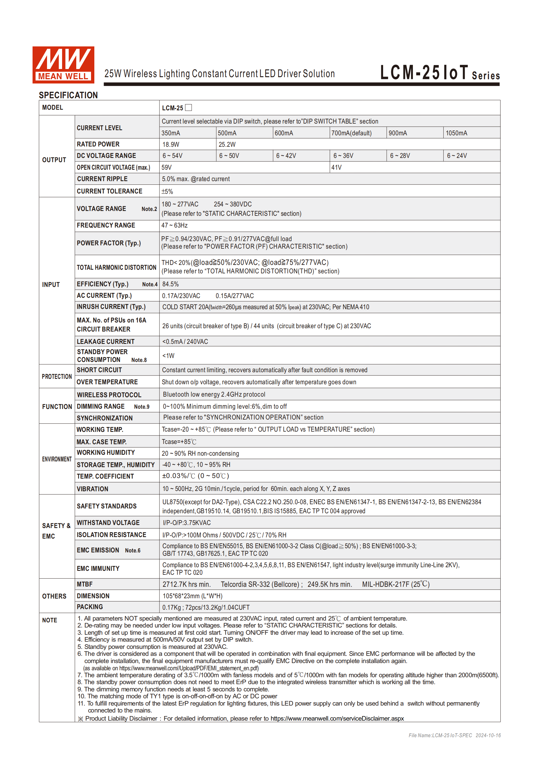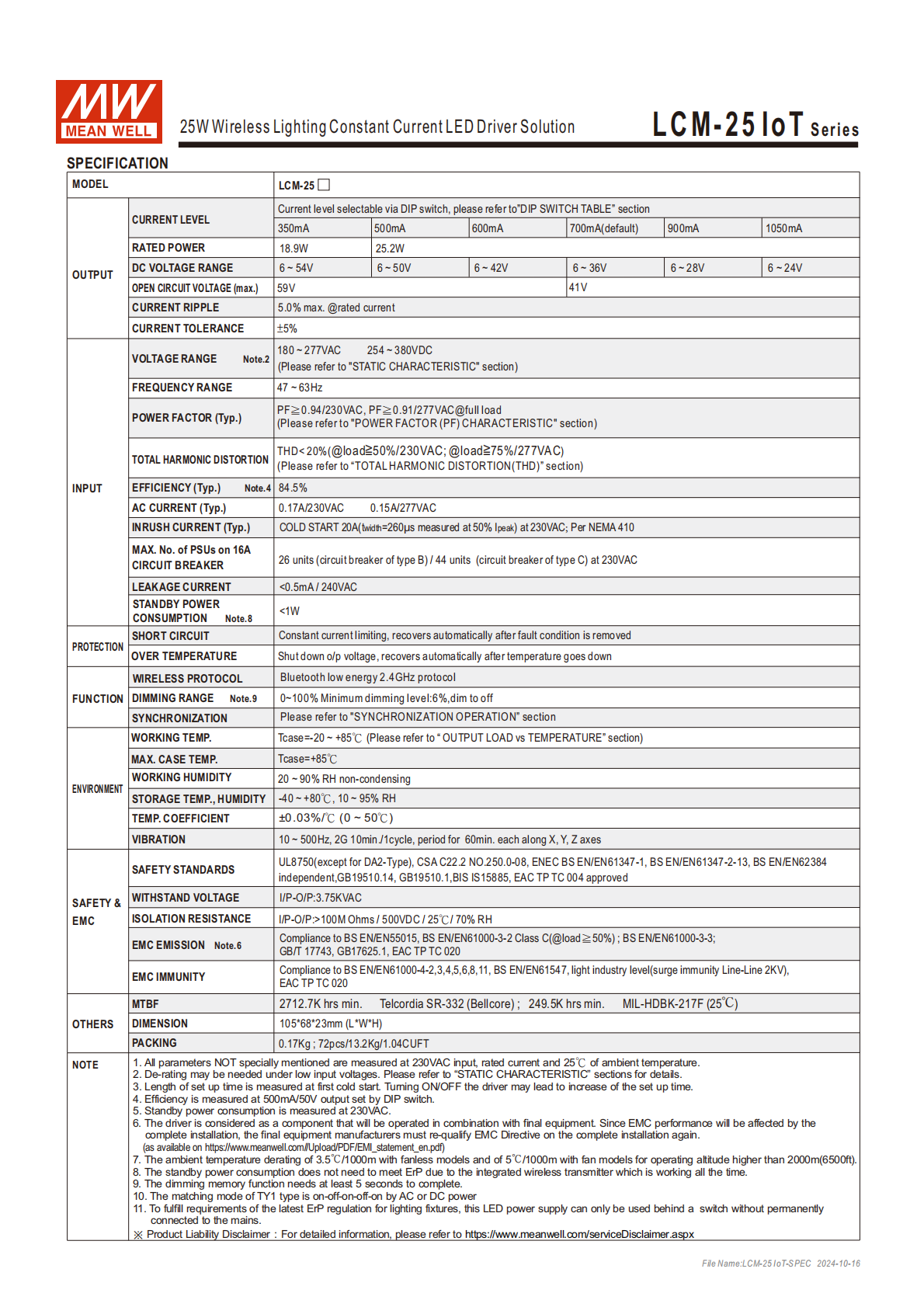 明緯 LCM-25 IoT 系列是 25W 交流變直流恒流型 LED 驅(qū)動器,集成低能耗藍(lán)牙 2.4GHz 通訊,輸入電壓覆蓋 180~277VAC,輸出電流可通過 DIP 開關(guān)在350mA~1050mA間六檔調(diào)節(jié),默認(rèn) 700mA,轉(zhuǎn)換效率最高達(dá)84.5%,支持10 臺設(shè)備同步操作(1 主 9 輔),調(diào)光范圍 0~100%(最低 6%),具備短路、過溫等多重保護(hù),工作溫度為機(jī)殼 - 20℃~+85℃,塑膠外殼 Class Ⅱ 設(shè)計,適配 Casambi、Tuya、Silvair 等多種藍(lán)牙解決方案,適用于各類 LED 智能照明場景,提供 3 年保固。