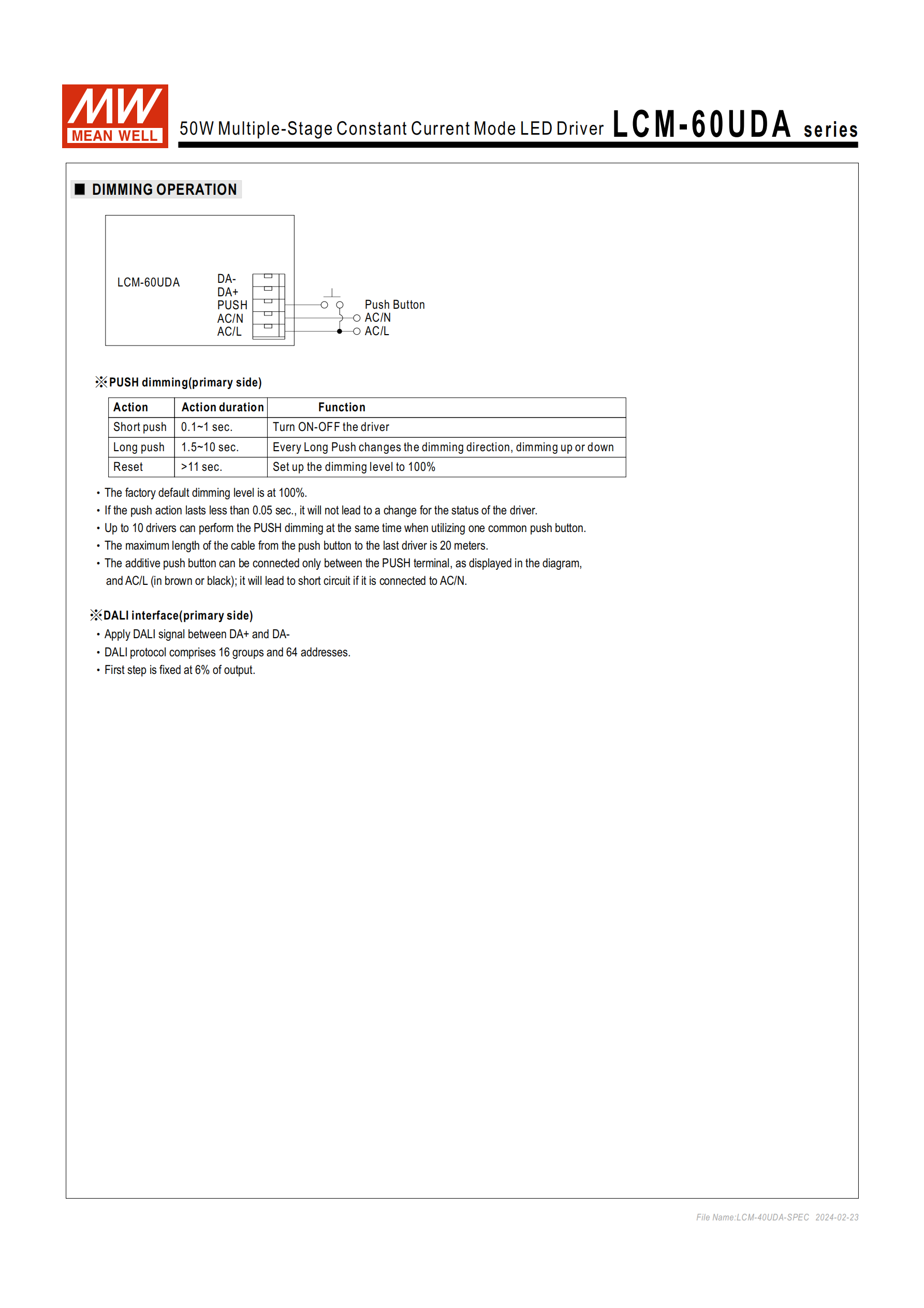 按壓調(diào)光:初級(jí)側(cè)實(shí)現(xiàn),短按(0.1~1s)控制開(kāi)關(guān),長(zhǎng)按(1.5~10s)切換調(diào)光方向,復(fù)位按(>11s)恢復(fù) 100% 亮度;單按鍵最多支持10 臺(tái)同步按壓調(diào)光,按鍵到最后一臺(tái)驅(qū)動(dòng)器電纜最大20 米,按鈕僅可接 PUSH 終端與 AC/L。