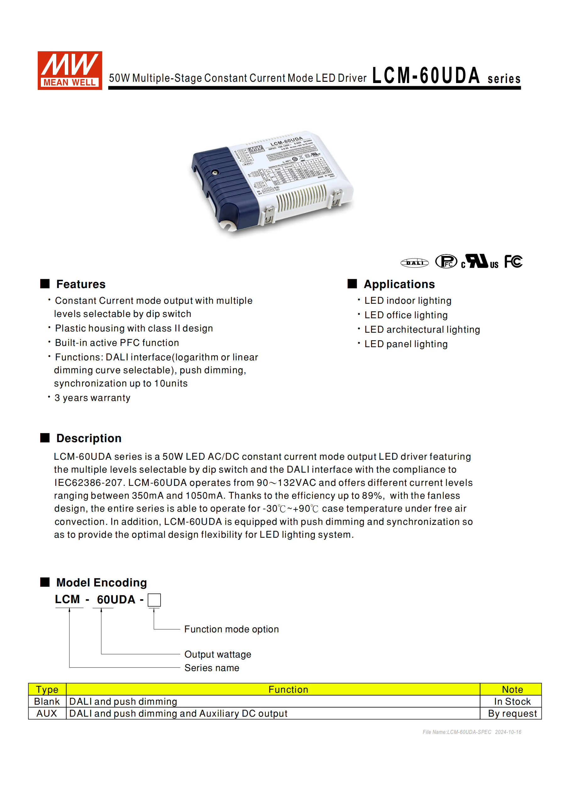 明緯 LCM-60UDA 系列為50W 多級(jí)輸出恒流型 LED 交流變直流驅(qū)動(dòng)器,主打無(wú)風(fēng)扇自然風(fēng)冷設(shè)計(jì),核心適配 LED 照明系統(tǒng),符合 IEC62386-207 標(biāo)準(zhǔn),提供3 年保固,分為標(biāo)準(zhǔn)品(Blank)和AUX 選購(gòu)品兩類(lèi),塑膠外殼搭配 Class II 設(shè)計(jì),廣泛應(yīng)用于 LED 室內(nèi)、辦公、建筑、板燈照明場(chǎng)景。產(chǎn)品尺寸為123.581.523mm(LWH),單臺(tái)重 0.28Kg,包裝規(guī)格 54pcs/16Kg/1.12CUFT,MTBF 值達(dá) 2284.6K hrs min.(Telcordia SR-332)。