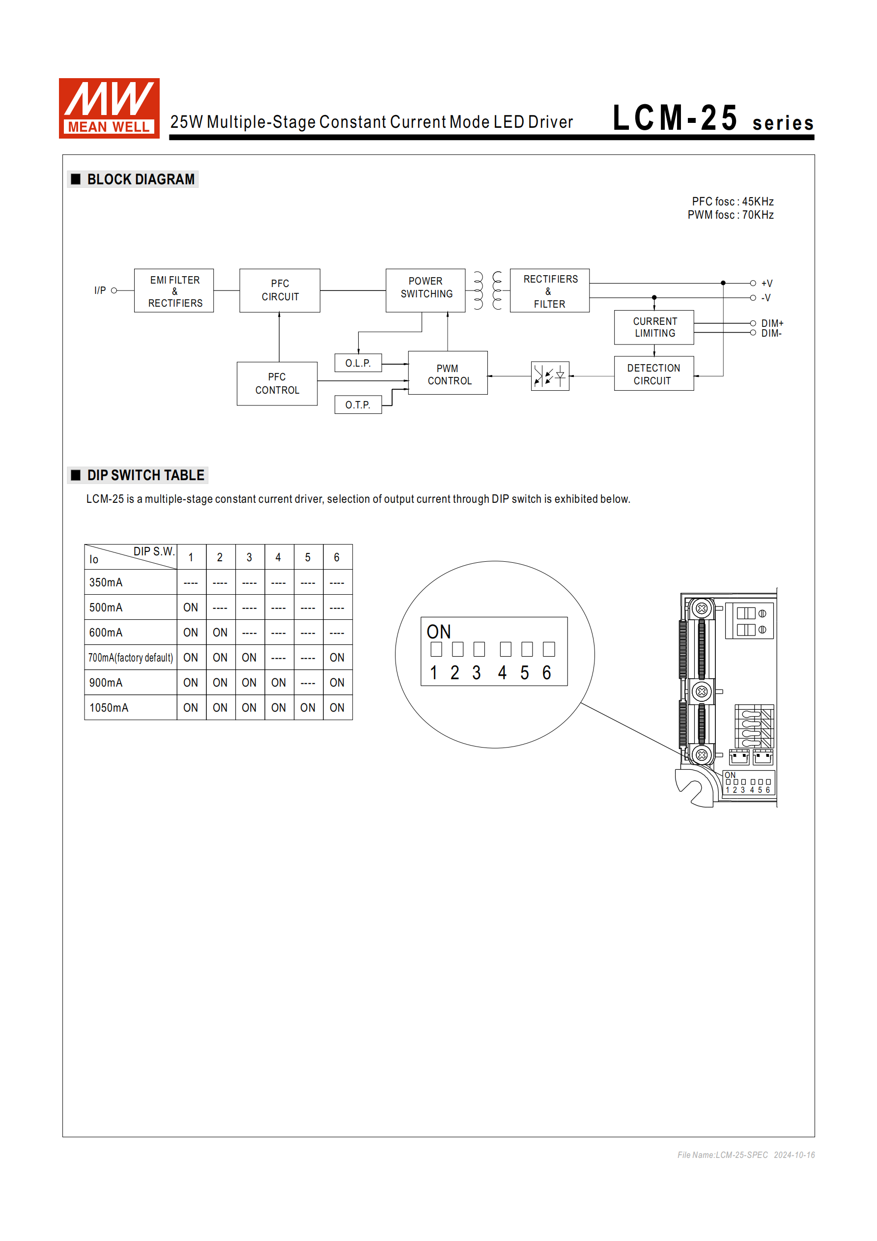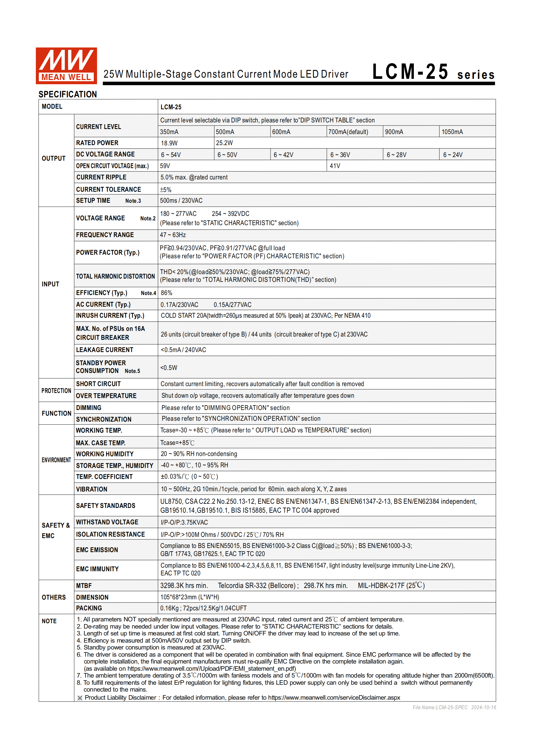明緯LCM-25 系列是 25W 多級輸出恒流型 LED 驅動器,采用塑膠外殼 Class Ⅱ 設計,輸入電壓覆蓋180~277VAC,可通過 DIP 開關選擇350mA~1050mA六檔輸出電流,直流電壓范圍隨電流不同為 6~54V 至 6~24V,內置主動式 PFC功能,擁有三合一調光和最多10 臺同步的功能,待機功耗 **<0.5W**,轉換效率最高86%,無風扇設計可在 **-30℃~+85℃** 機殼溫度下自然風冷工作,具備短路、過溫保護且可自動恢復,通過多項安規(guī)認證,提供 3 年保固,適用于各類 LED 室內、辦公、建筑及板燈照明場景。