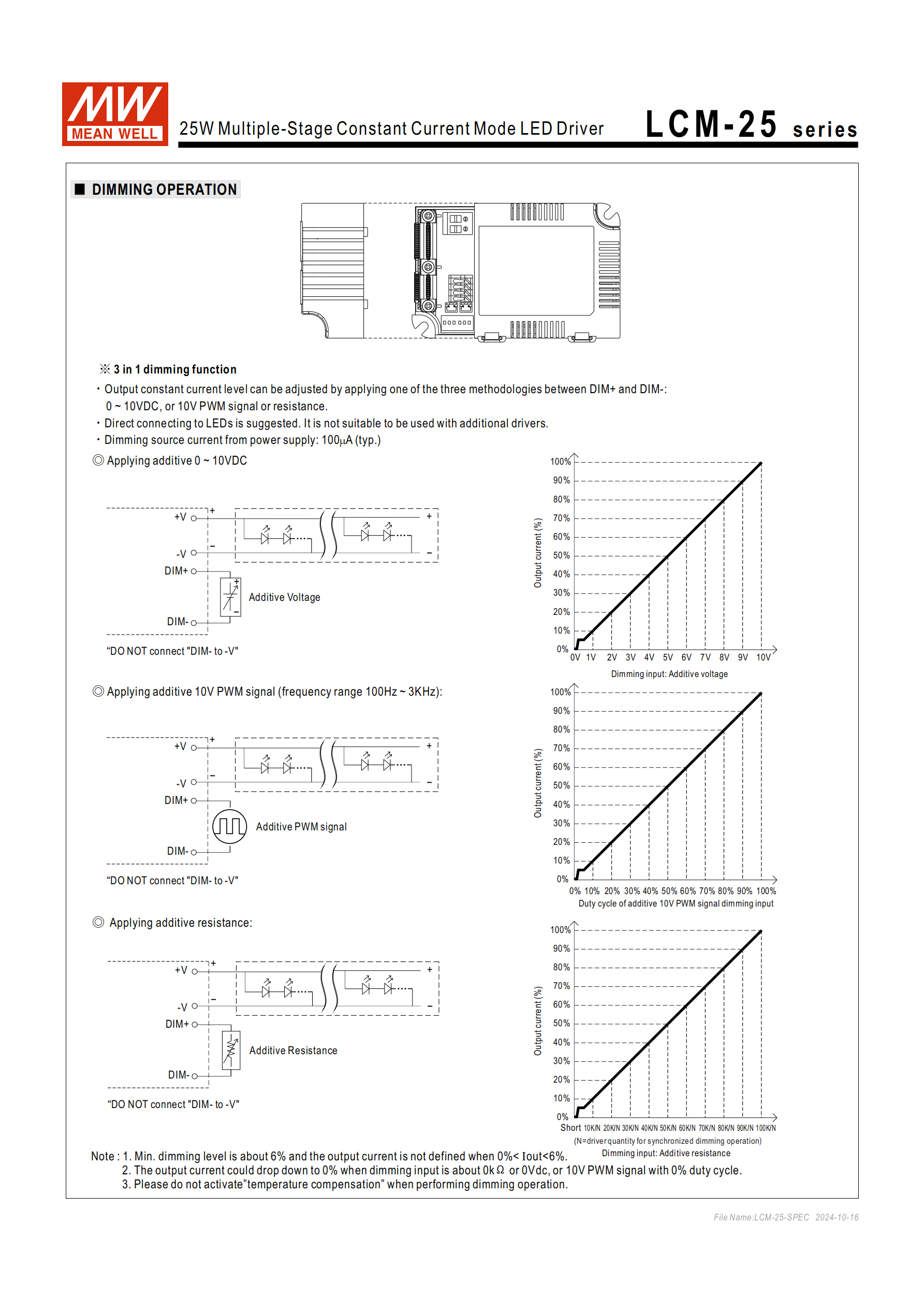 答案:三合一調光支持0~10VDC 直流電壓、10V PWM 信號(頻率 100Hz~3KHz)、外接電阻三種方式;核心限制與注意事項:①最小調光比例約 6%,0%<Iout<6% 時電流精度無定義,0Ω/0V/PWM 占空比 0% 時輸出電流可降至 0%;②不可將 DIM - 與 - V 連接;③調光操作時禁止激活 “溫度補償”;④調光端口典型輸出電流為 100μA。