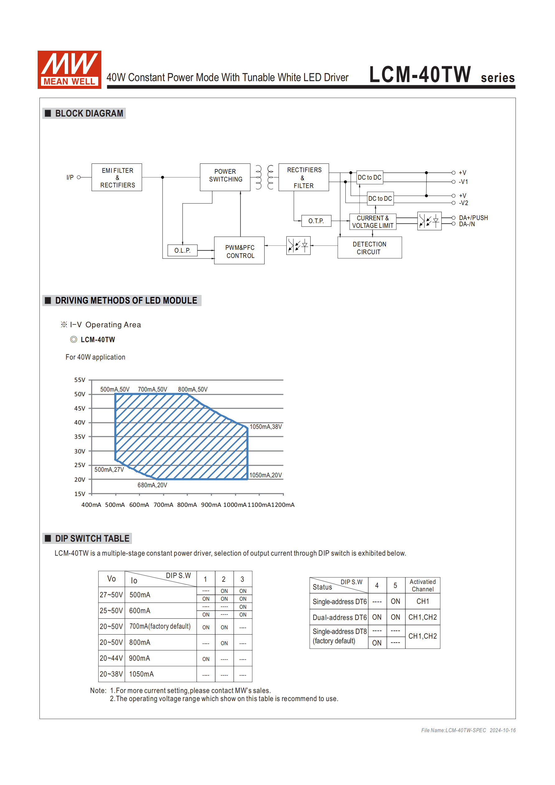 明緯 LCM-40TW 系列是40W 恒功率可調(diào)色溫 LED 驅(qū)動(dòng)器,支持DALI-2 DT6/DT8色溫與亮度控制,采用雙通道恒功率輸出模式,輸入電壓覆蓋180~277VAC/260~390VDC,輸出電流可通過撥碼開關(guān)在500~1050mA調(diào)節(jié),具備無頻閃(符合 IEEE1789)、高 PF(≥0.95)、低待機(jī)功耗(<0.5W) 等特性,工作溫度達(dá) **-30℃~+85℃,擁有過載、短路、過溫多重保護(hù),適配可調(diào)色溫照明、商業(yè)照明等場景,提供5 年保固 **,還可通過按鍵或 DALI 協(xié)議實(shí)現(xiàn)調(diào)光調(diào)色溫,設(shè)計(jì)彈性優(yōu)異。