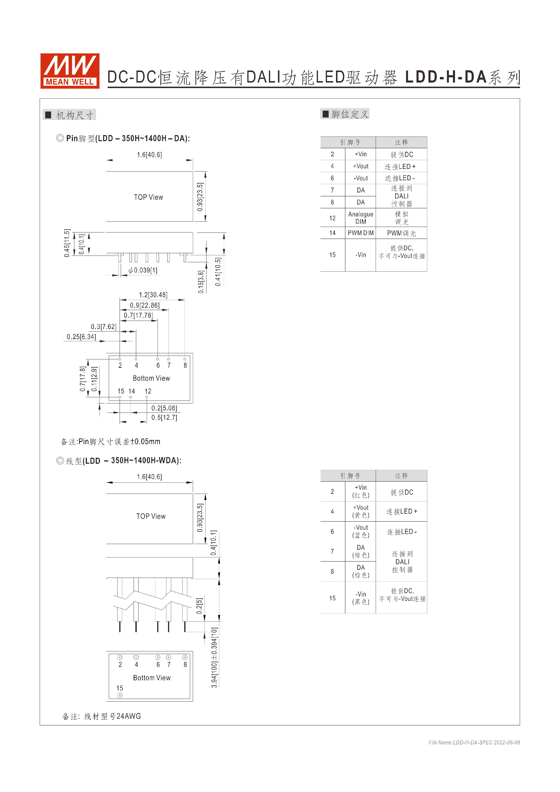 引腳號 引腳名稱 / 顏色(線型) 功能說明 2 +Vin / 紅色 直流輸入正極 4 +Vout / 黃色 LED 連接正極 6 -Vout / 藍色 LED 連接負極 7/8 DA / 棕色 連接 DALI 控制器 12 Analogue DIM / 無 模擬調(diào)光(僅引腳型) 14 PWM DIM / 無 PWM 調(diào)光(僅引腳型) 15 -Vin / 黑色 直流輸入負極,不可接 - Vout