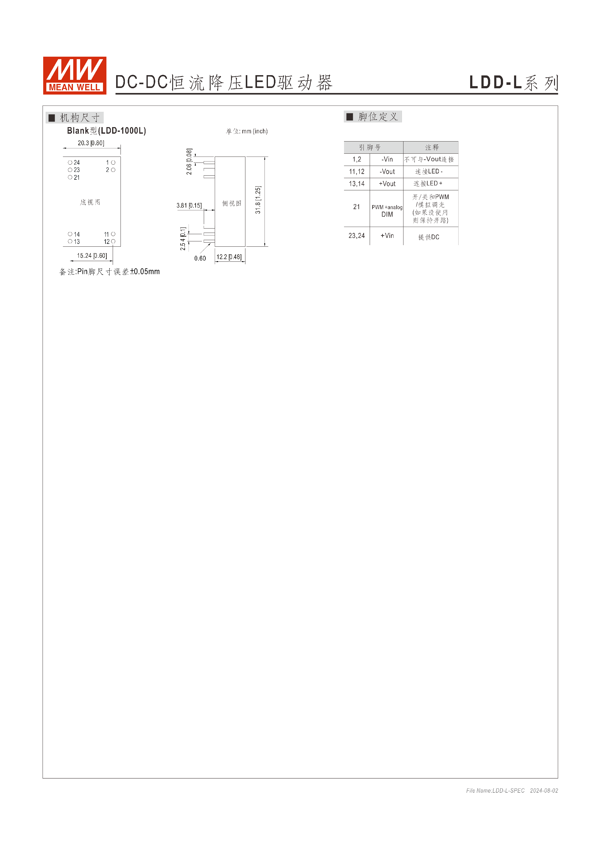 1000mA 款:24 引腳,1/2 (-Vin)、11/12 (-Vout)、13/14 (+Vout)、21 (PWM + 模擬 DIM)、23/24 (+Vin) 有效,其余無連接;