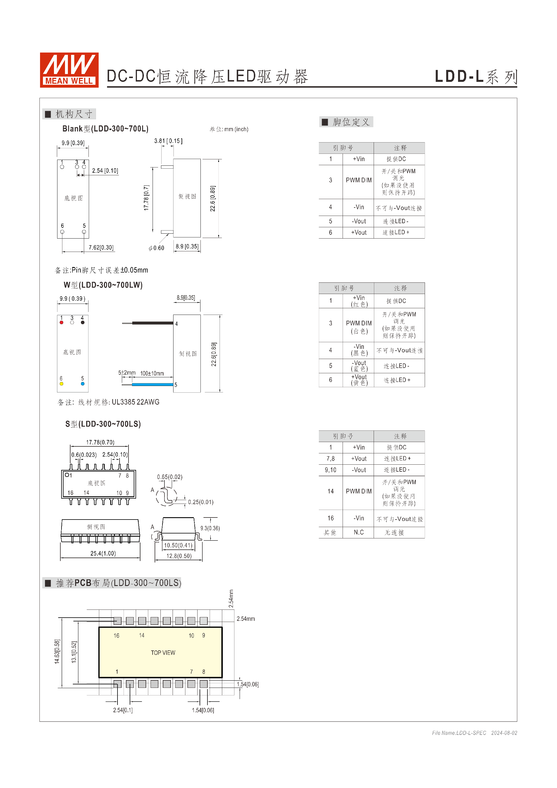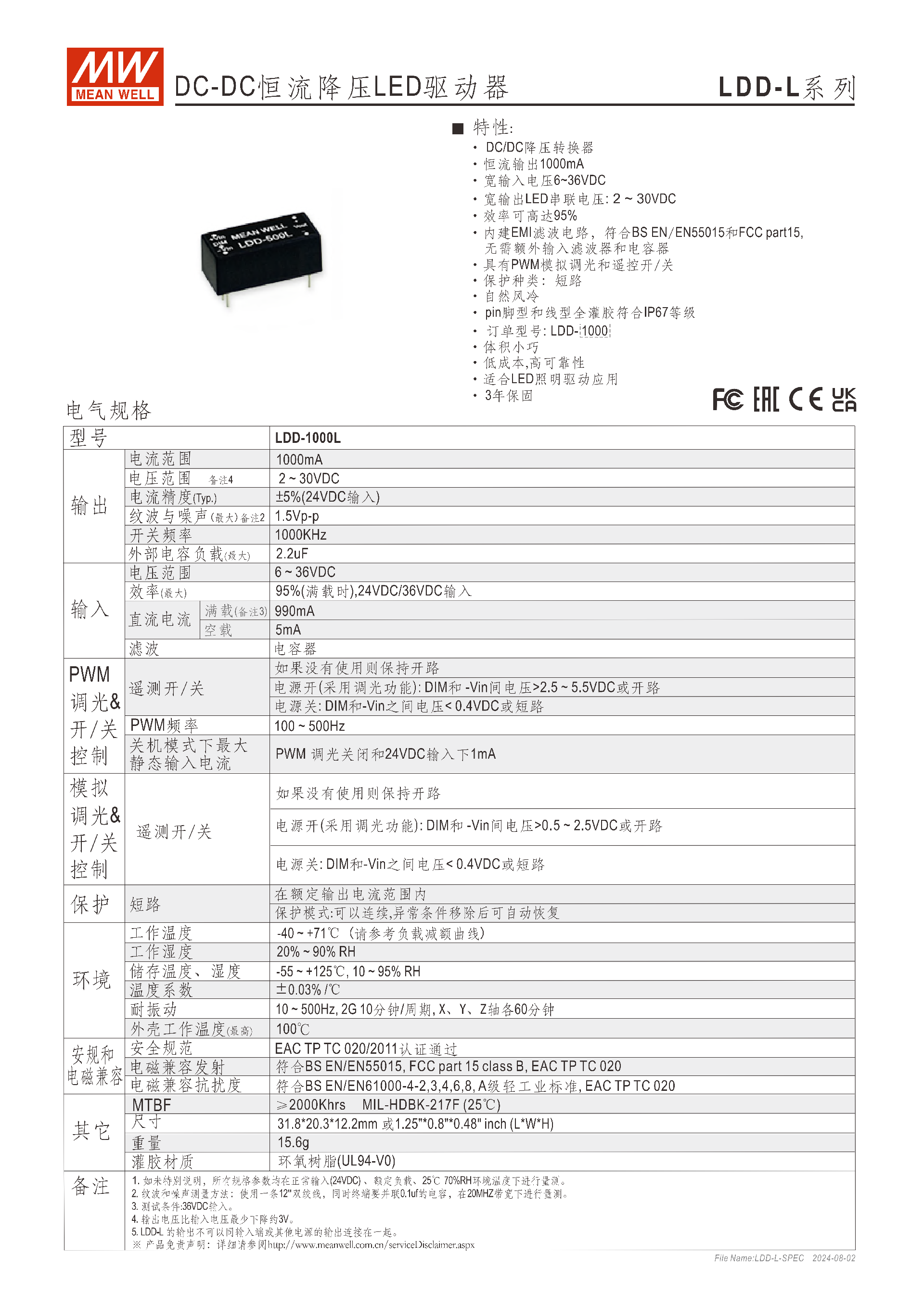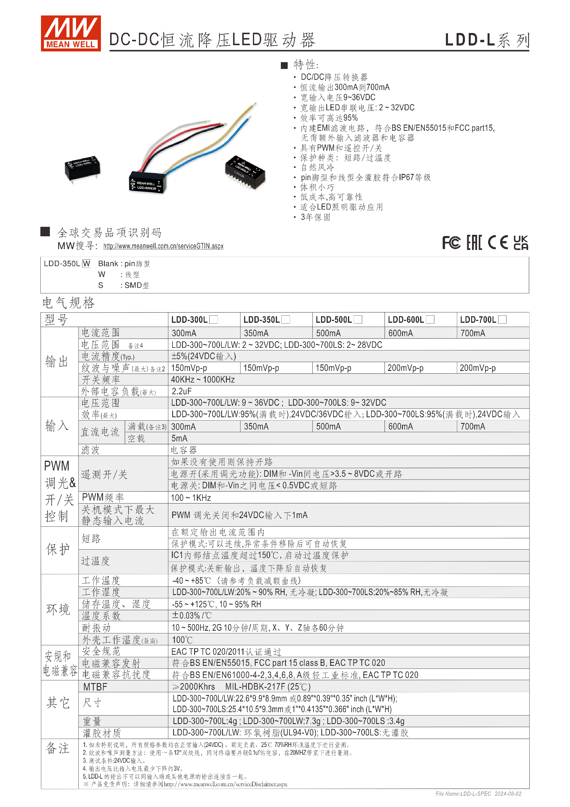 本文檔為明緯LDD-L 系列 DC-DC 恒流降壓 LED 驅(qū)動器的產(chǎn)品規(guī)格書,涵蓋 300~700mA 和 1000mA 兩大電流版本,詳細說明產(chǎn)品特性、電氣規(guī)格、保護功能、環(huán)境參數(shù)、物理尺寸、調(diào)光控制、包裝等核心信息,是該系列產(chǎn)品選型、應用的核心參考依據(jù),以下為分模塊詳細總結(jié):