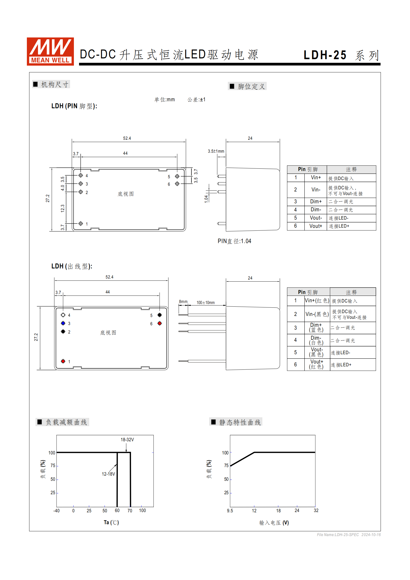 明緯 LDH-25 系列是 DC-DC 升壓式恒流 LED 驅(qū)動(dòng)電源,輸入電壓覆蓋9.5V~32VDC,提供250/350/500/700mA四檔恒流輸出,最高輸出電壓達(dá)84VDC、轉(zhuǎn)換效率至95.5%,支持0-10V 直流 + 1KHz-3KHz 10V PWM二合一調(diào)光,具備短路、過(guò)電壓保護(hù),采用全灌膠、自然風(fēng)冷設(shè)計(jì),防護(hù)性優(yōu)異,適配電池供電、太陽(yáng)能路燈、溫室照明等移動(dòng)式 / 戶外 LED 照明場(chǎng)景,擁有 3 年保固,同時(shí) PIN 腳型和出線型兩種結(jié)構(gòu)可選,電氣與機(jī)械規(guī)格完善,應(yīng)用需遵循特定接線和 EMC 要求。