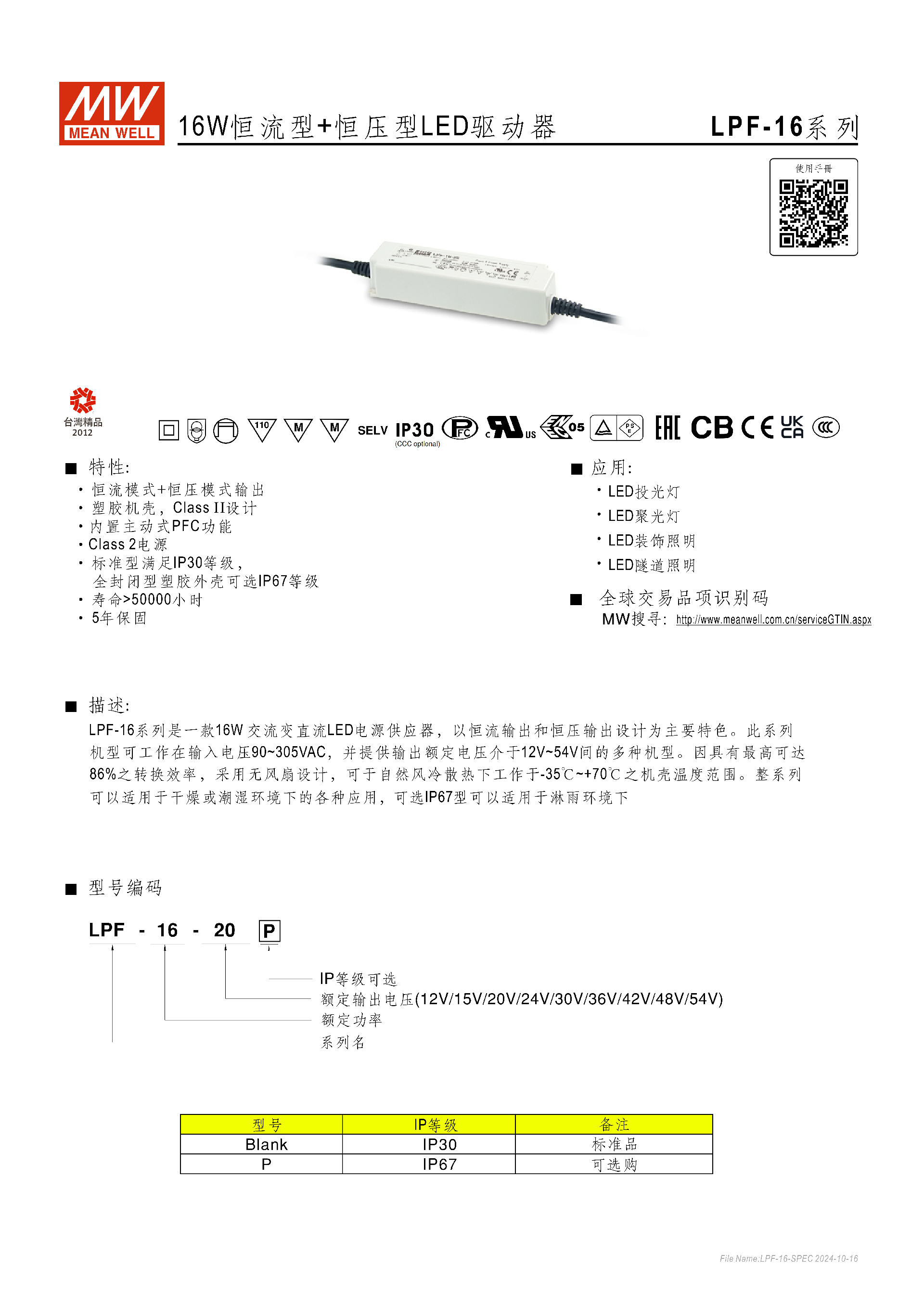 明緯LPF-16 系列是 16W 恒流 + 恒壓雙模式 LED 驅(qū)動器,具備IP30 標(biāo)準(zhǔn)品 / IP67 可選的防護(hù)等級,輸入電壓覆蓋90~305VAC,輸出額定電壓為 12V~54V 多檔位,轉(zhuǎn)換效率最高達(dá)86%,內(nèi)置主動式 PFC 功能,功率因數(shù)滿載時最高≥0.97,工作溫度范圍 **-35℃~+70℃,壽命超50000 小時 ** 且提供 5 年保固,采用 Class II 設(shè)計、無風(fēng)扇自然風(fēng)冷,適配 LED 投光、聚光等多種照明場景,同時具備過流、短路、過壓、過溫等完善的自動恢復(fù)式保護(hù)功能。