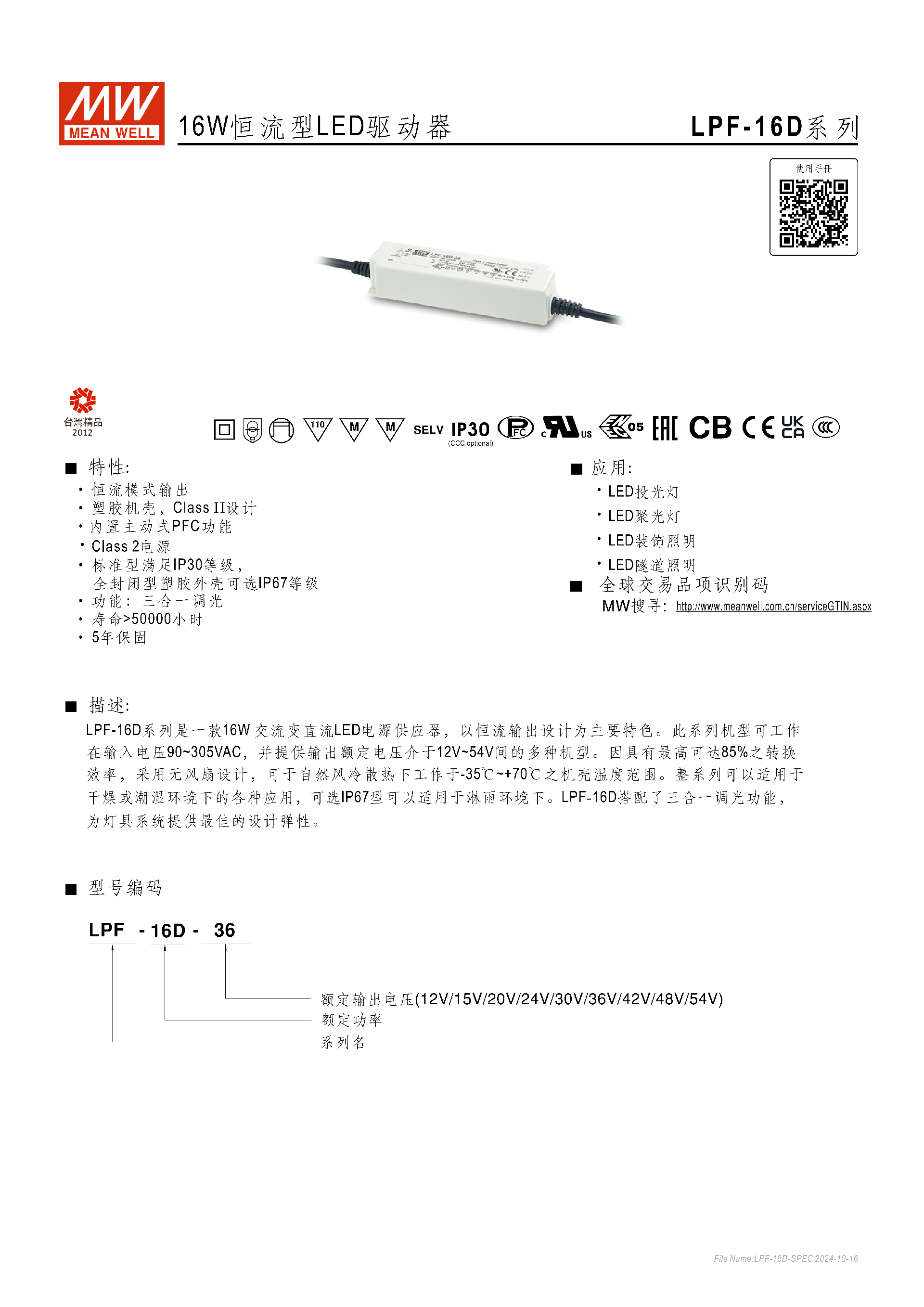 明緯LPF-16D 系列是 16W 恒流型 LED 驅(qū)動器,采用 Class II 設(shè)計、塑膠機(jī)殼,標(biāo)配IP30防護(hù)等級且可選IP67,內(nèi)置主動式 PFC 功能,支持三合一調(diào)光,輸入電壓覆蓋 90~305VAC/127~431VDC,輸出額定電壓 12V~54V 多機(jī)型可選,轉(zhuǎn)換效率最高達(dá)85%,無風(fēng)扇自然風(fēng)冷設(shè)計可在 **-35℃~+70℃機(jī)殼溫度下工作,壽命超50000 小時 **、提供5 年保固,具備過流、短路、過壓、過溫多重自動恢復(fù)式保護(hù),安規(guī)認(rèn)證齊全,適用于 LED 投光、聚光、裝飾、隧道等照明場景。