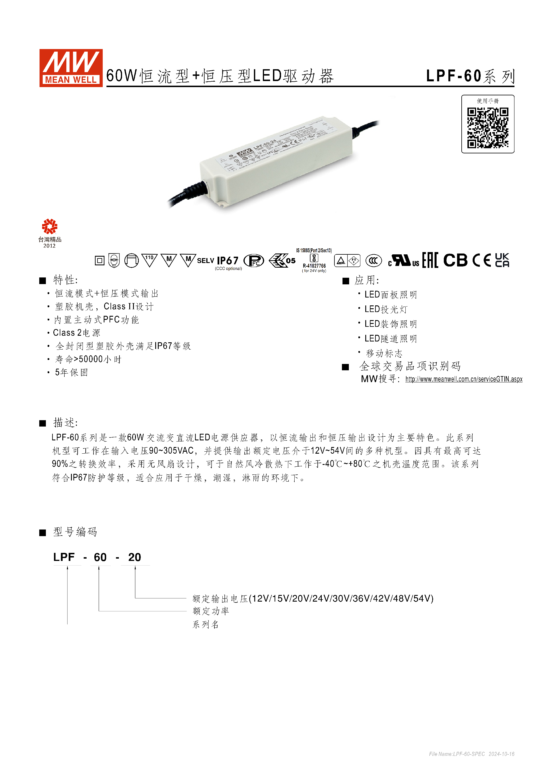 明緯LPF-60 系列是 60W 恒流 + 恒壓型 LED 驅(qū)動器,采用塑膠機(jī)殼 Class II 設(shè)計,具備IP67防護(hù)等級與內(nèi)置主動式 PFC 功能,輸入電壓覆蓋90~305VAC,輸出額定電壓有 12V 至 54V 九種規(guī)格,轉(zhuǎn)換效率最高達(dá)90%,無風(fēng)扇自然風(fēng)冷設(shè)計可在 **-40℃~+80℃機(jī)殼溫度下工作,壽命超50000 小時 ** 且提供 5 年保固,適配面板、投光、隧道等多種 LED 照明場景,同時具備過流、短路、過壓、過溫等多重保護(hù),符合多項(xiàng)國際安全與電磁兼容規(guī)范。