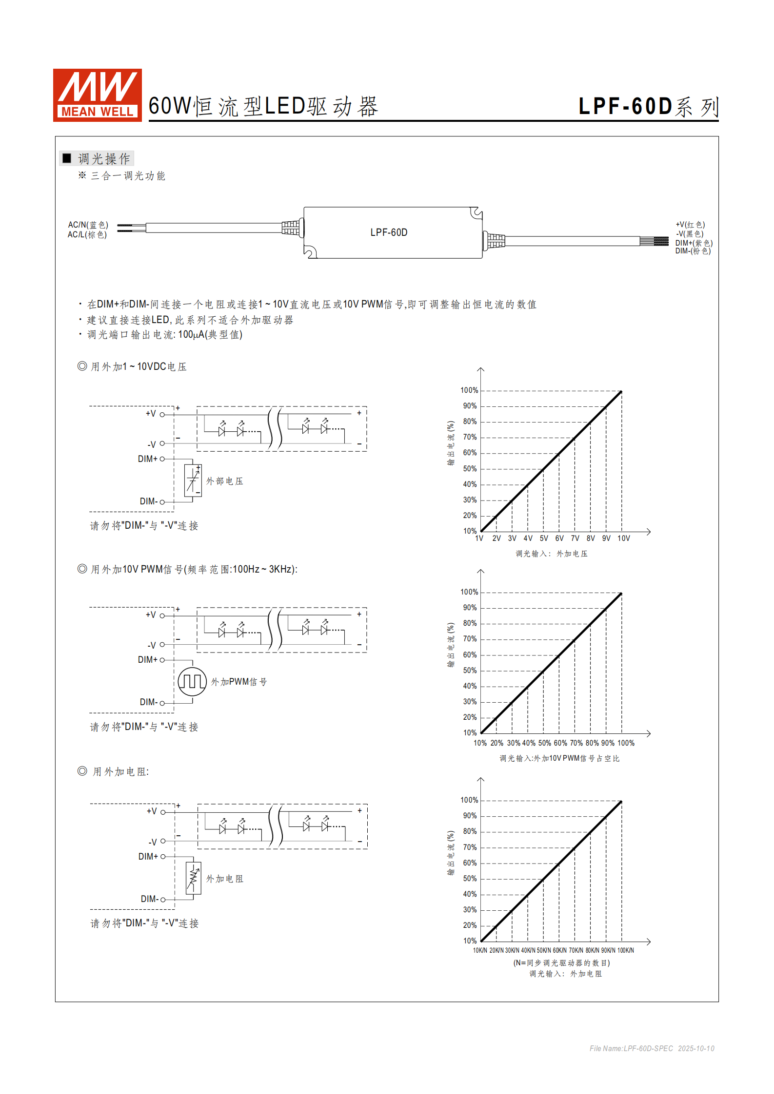1~10VDC 電壓調(diào)光:輸入 1V 對(duì)應(yīng) 10% 輸出電流,10V 對(duì)應(yīng) 100% 輸出電流,線(xiàn)性調(diào)節(jié)。