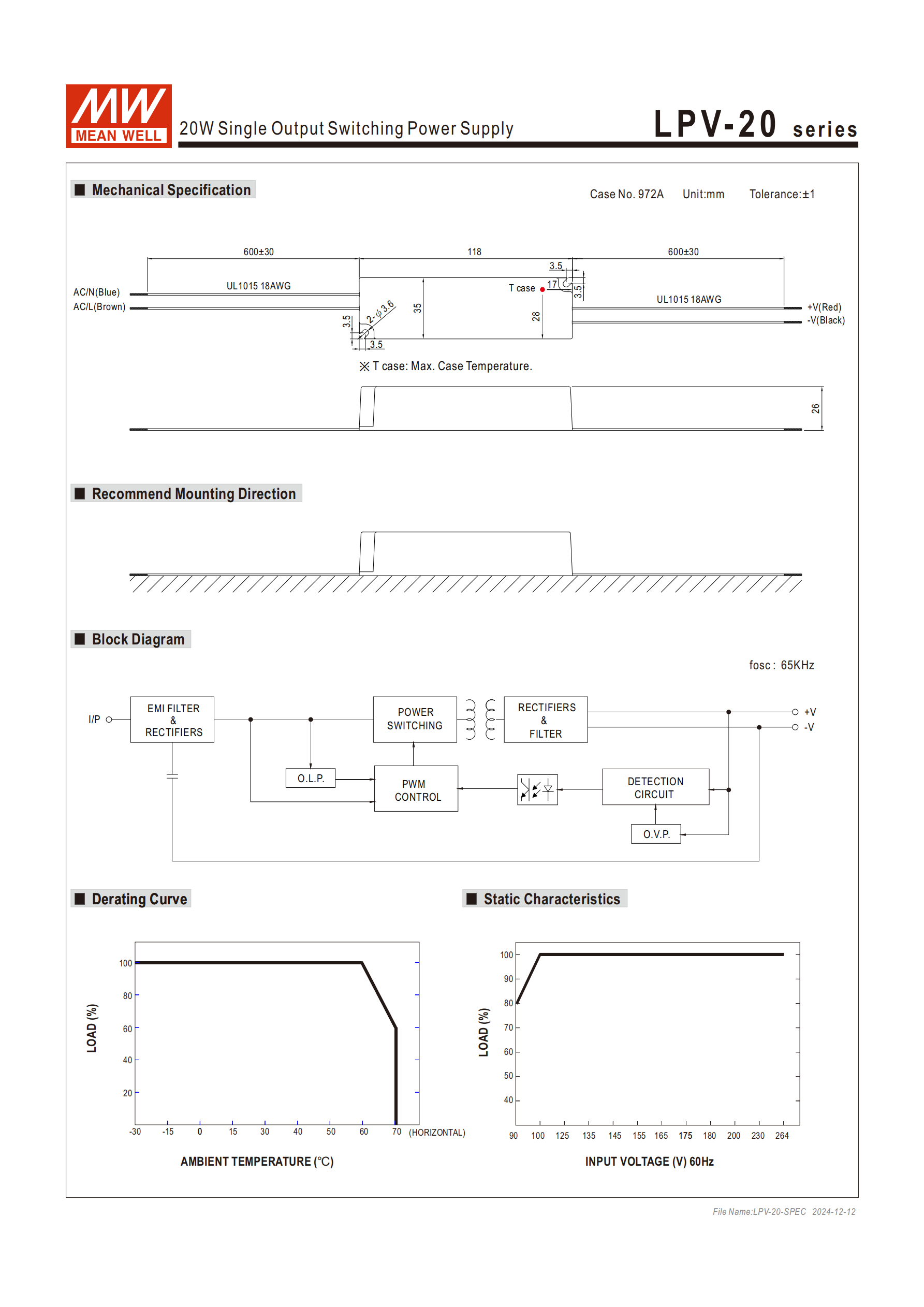 本文檔為明緯LPV-20 系列 20W 單組輸出開關(guān)電源的技術(shù)規(guī)格書,詳細(xì)列明了該系列電源的核心特性、輸出規(guī)格、電氣參數(shù)、保護(hù)功能、環(huán)境要求、認(rèn)證標(biāo)準(zhǔn)、物理尺寸及應(yīng)用備注等關(guān)鍵信息,以下為分點(diǎn)詳細(xì)總結(jié):