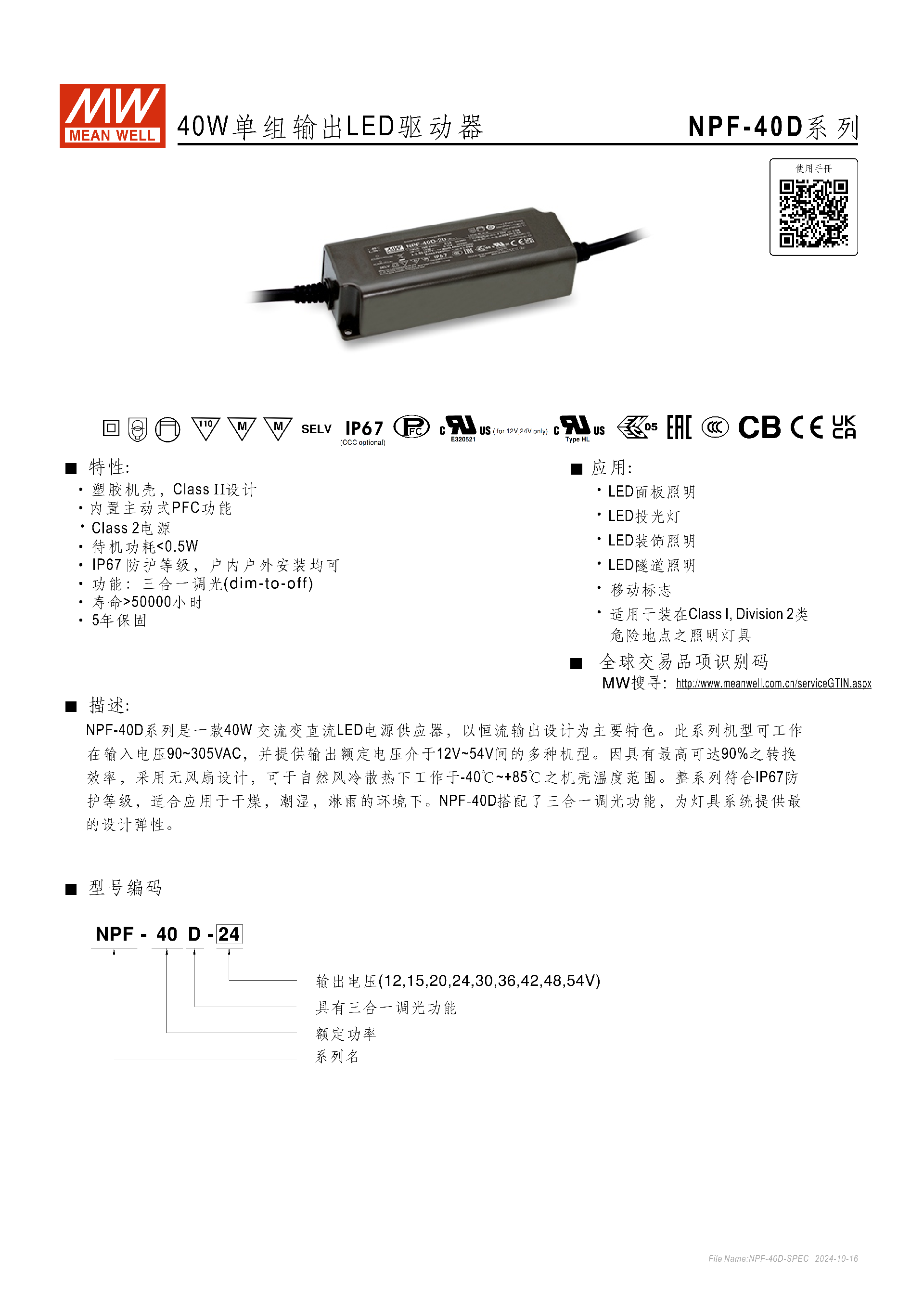 明緯LPF-40D 系列是 40W 恒流型 LED 驅(qū)動(dòng)器,具備IP67防護(hù)等級(jí),輸入電壓覆蓋 90~305VAC,輸出額定電壓 12V~54V 共 9 款機(jī)型,轉(zhuǎn)換效率最高達(dá)89%,搭載三合一調(diào)光功能,采用 Class II 設(shè)計(jì)、內(nèi)置主動(dòng)式 PFC,工作溫度為 - 40℃~+80℃機(jī)殼溫度,壽命超50000 小時(shí)且提供 5 年保固,防護(hù)含過(guò)流、短路、過(guò)壓、過(guò)溫保護(hù),適用于面板照明、投光燈等多種 LED 照明場(chǎng)景,戶內(nèi)戶外均可安裝。
