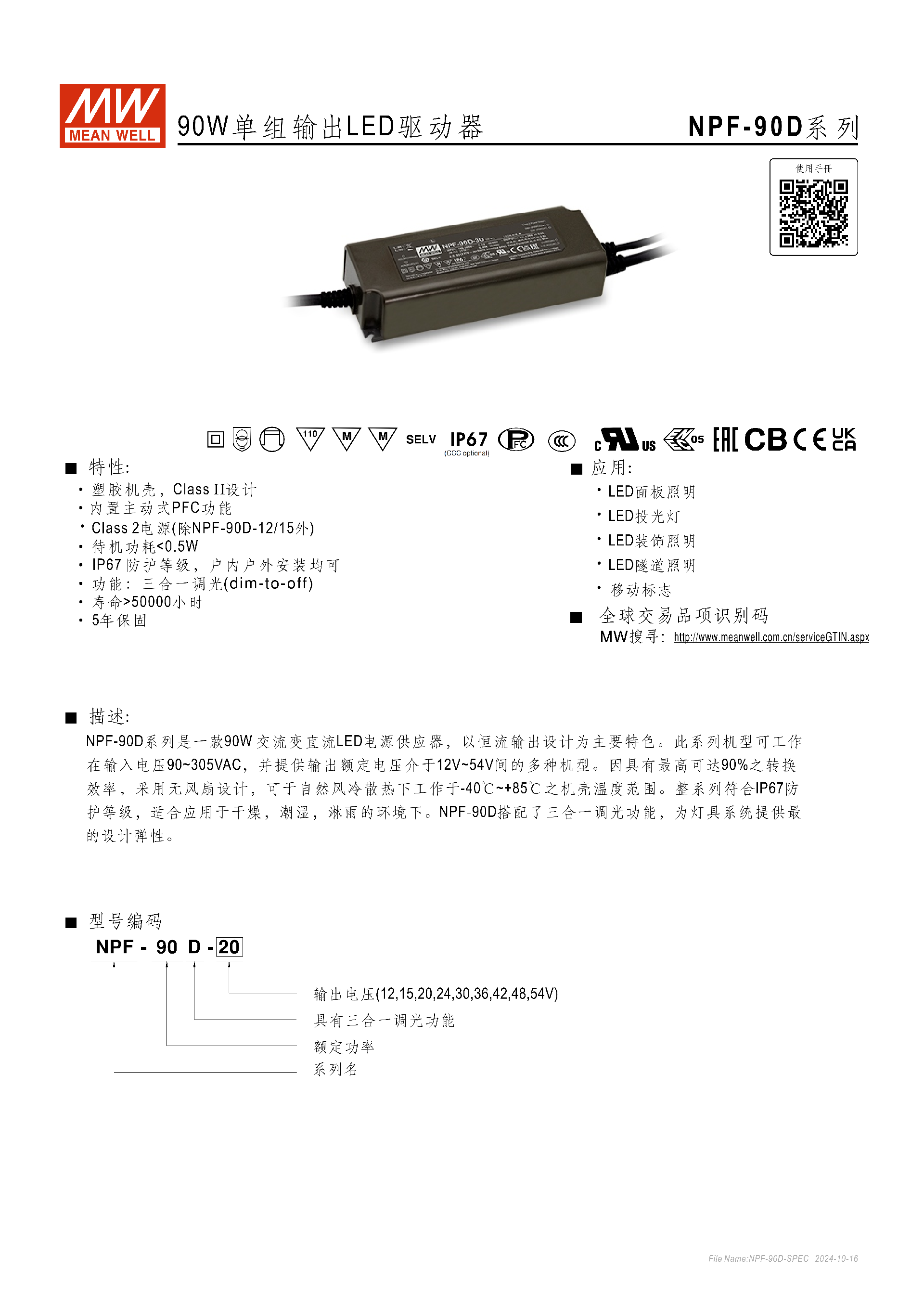 明緯NPF-90D 系列是 90W 單組輸出恒流 LED 驅動器,采用塑膠機殼 Class II 設計,具備IP67防護等級,支持 90~305VAC 寬輸入電壓,輸出額定電壓涵蓋 12V~54V 多機型,核心特性為三合一調光、內置主動式 PFC、待機功耗 < 0.5W,轉換效率最高達 90%,無風扇設計可在 **-40℃~+85℃** 機殼溫度工作,壽命超 50000 小時且提供 5 年保固,適配面板、投光、隧道等多種 LED 照明場景,同時具備過流、短路、過壓、過溫多重保護,符合 UL8750、GB19510 等多項安規(guī)與 EMC 標準。