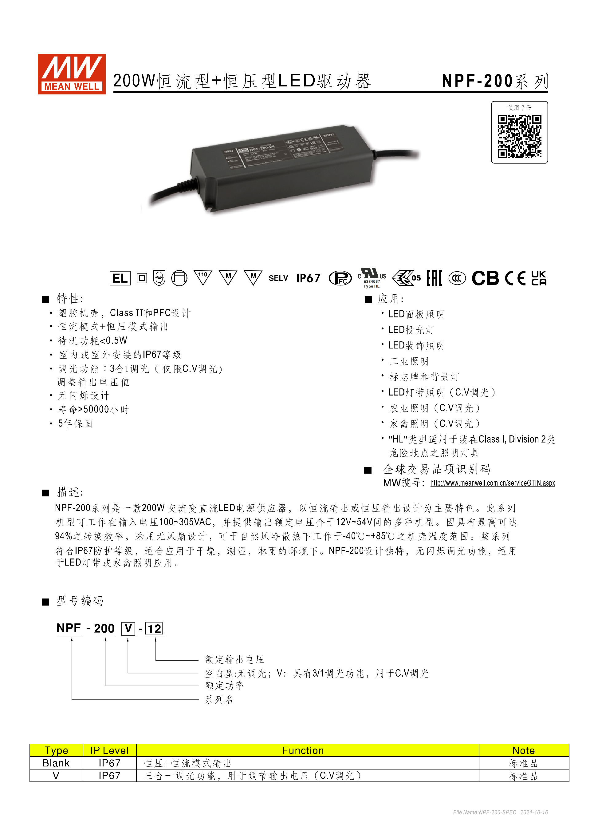 明緯NPF-200 系列為200W交流變直流 LED 驅(qū)動(dòng)器,核心設(shè)計(jì)為恒流 + 恒壓雙輸出模式,是適配多場(chǎng)景 LED 照明的電源供應(yīng)器,塑膠機(jī)殼設(shè)計(jì),具備 Class II 和 PFC 設(shè)計(jì),整體防護(hù)等級(jí)達(dá)IP67,可在干燥、潮濕、淋雨環(huán)境下室內(nèi) / 室外安裝,5 年保固,正常使用下壽命 **>50000 小時(shí) **,HL 類(lèi)型專(zhuān)屬適配 Class I, Division 2 類(lèi)危險(xiǎn)地點(diǎn)的照明燈具。