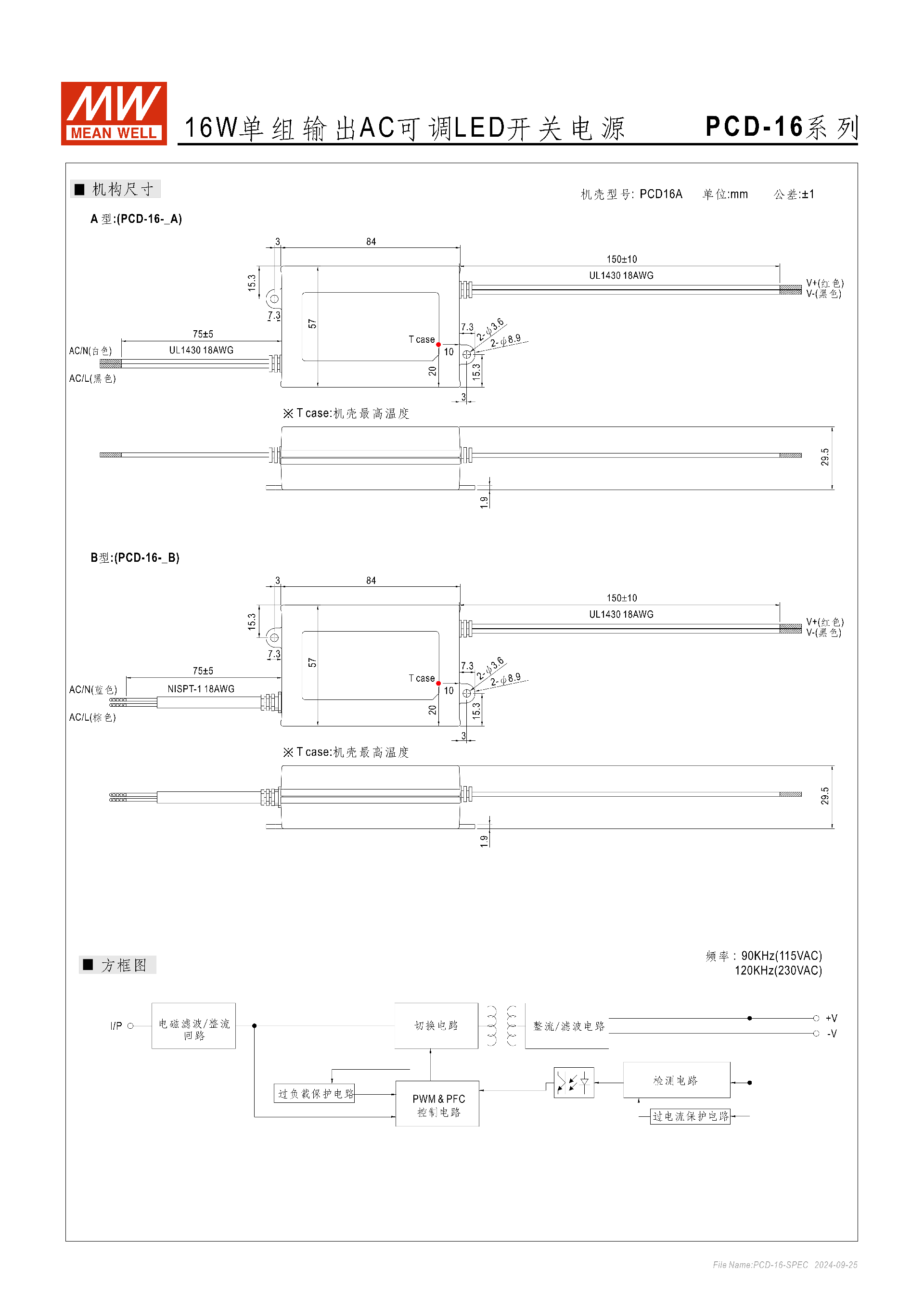本文檔為明緯PCD-16 系列 16W 單組輸出 AC 可調(diào) LED 開關電源的技術規(guī)格書,詳細介紹了該系列電源的核心特性、電氣規(guī)格、環(huán)境參數(shù)、安規(guī)認證、物理尺寸及調(diào)光應用等關鍵信息,該電源專為 LED 相關裝置設計,具備高可靠性、多防護、寬適配的特點,以下為分點詳細總結: