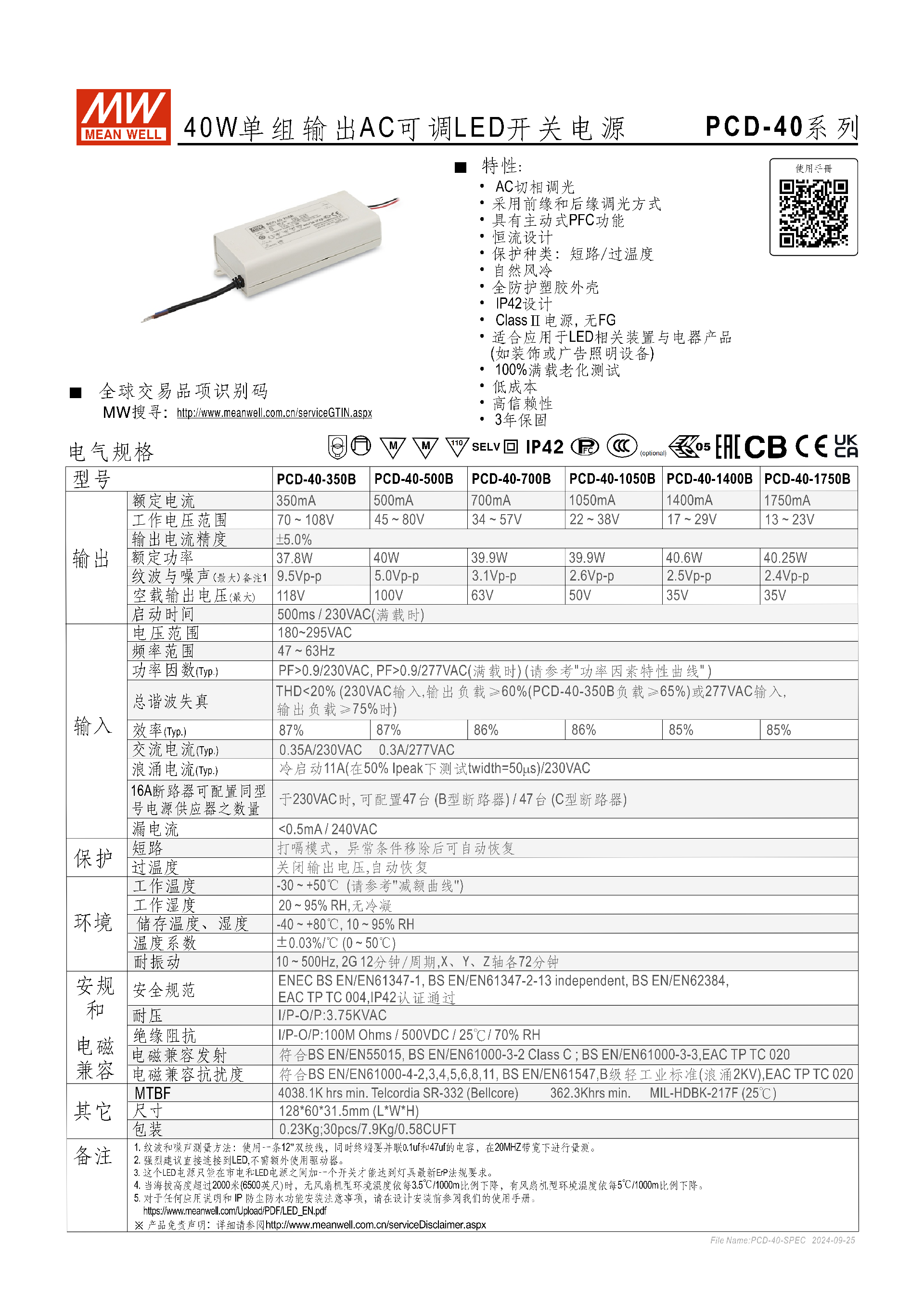 PCD-40 系列電源的核心電氣性能參數(shù)(輸入 / 能效 / 輸出)有哪些關(guān)鍵指標(biāo)?答:輸入上,電壓 180~295VAC、頻率 47~63Hz,漏電流 <0.5mA/240VAC;能效上,滿載時(shí) PF>0.9(230/277VAC),THD<20%(滿足指定負(fù)載條件),效率 85%-87%,MTBF 最高達(dá) 4038.1K hrs min(Telcordia SR-332 標(biāo)準(zhǔn));輸出上,含 350~1750mA 共 6 款額定電流型號(hào)(1050B 重復(fù)標(biāo)注),電流精度 ±5.0%,紋波噪聲最大 9.5Vp-p,啟動(dòng)時(shí)間 500ms/230VAC(滿載)。