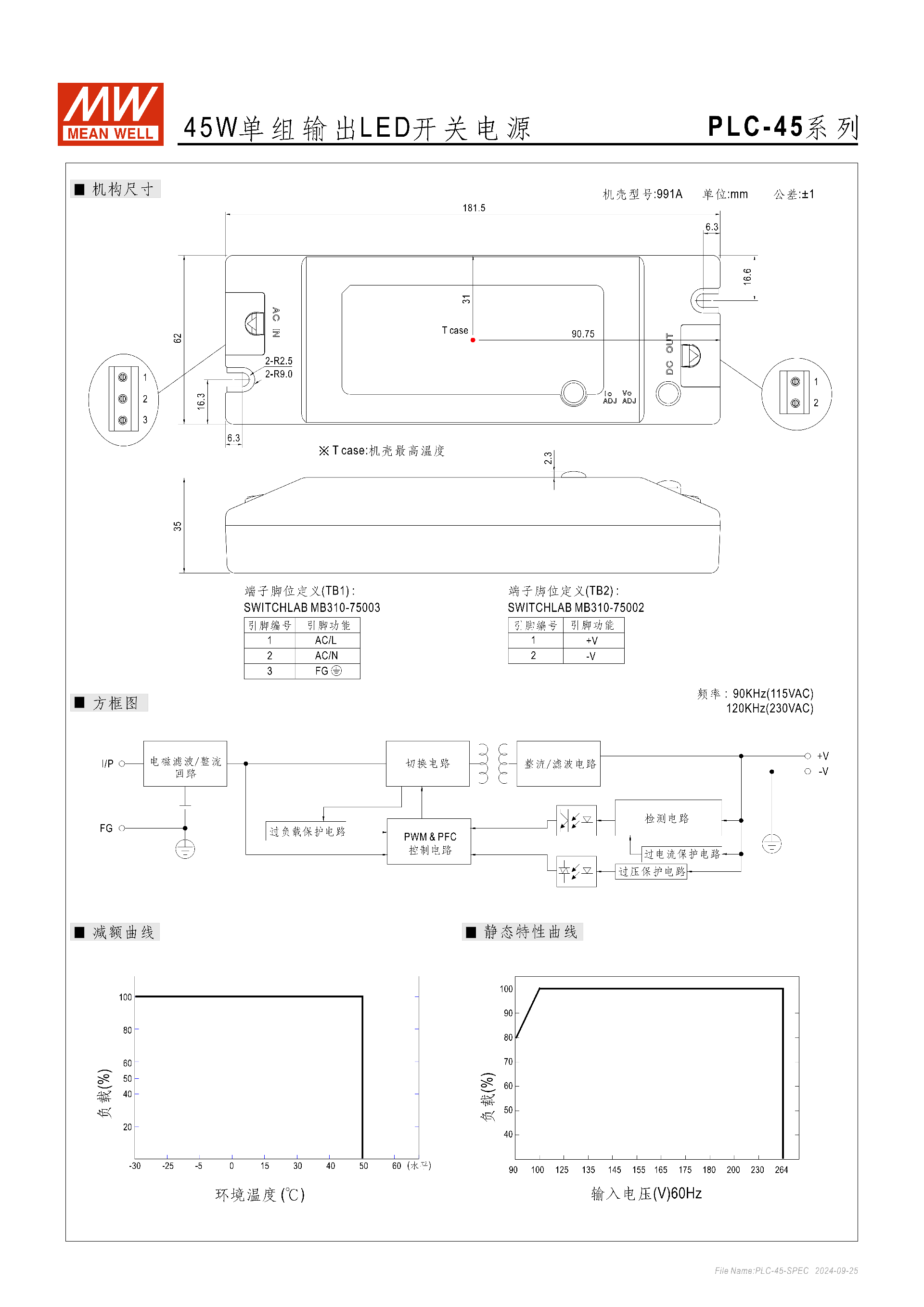 | PLC-45-24 | 24V | 18~24V | 1.9A | 0~1.9A | 45.6W | 2.7Vp-p |