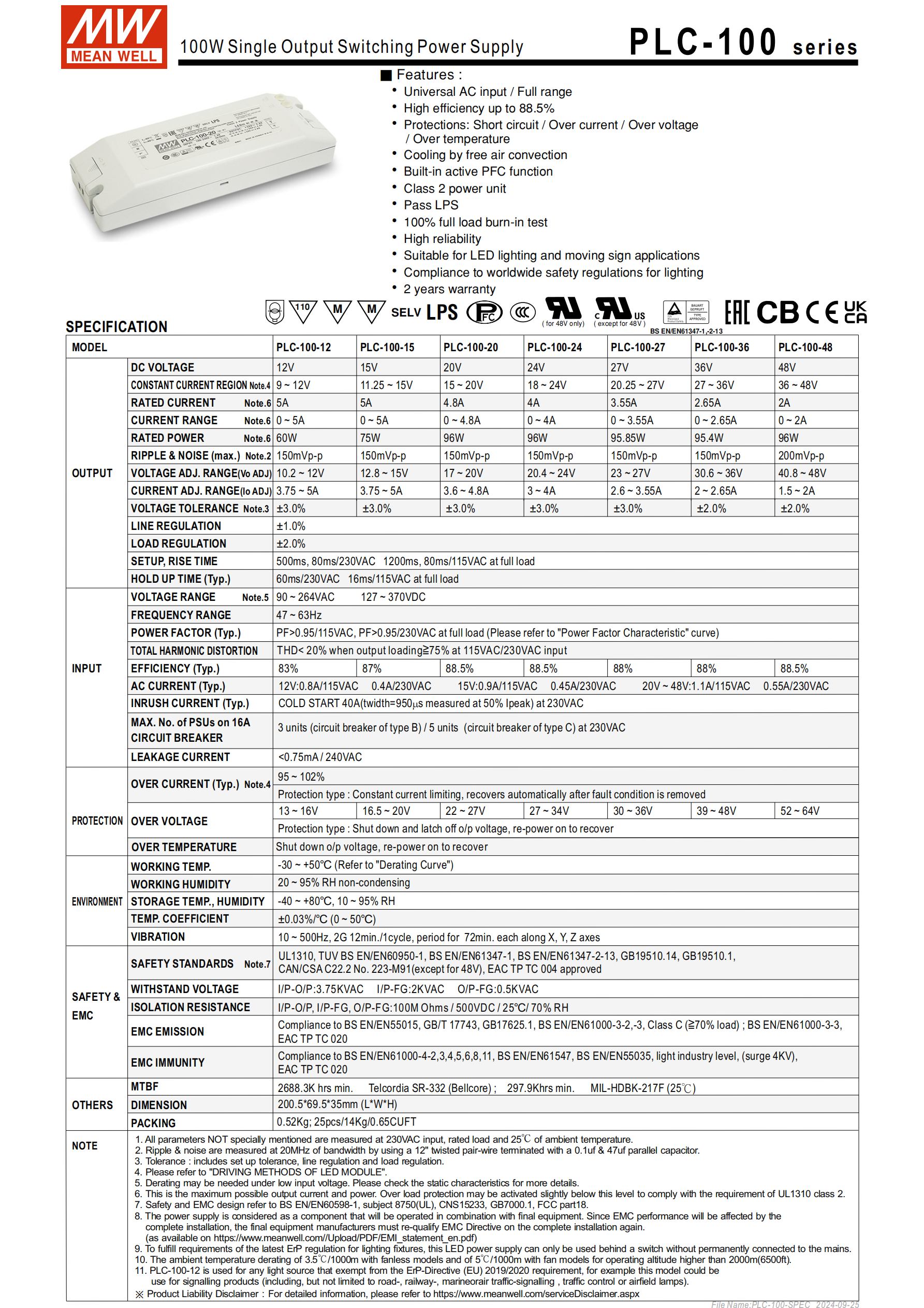 | PLC-100-36 | 36V | 2.65A | 95.4W | 27~36V | 30.6~36V | 150mVp-p |