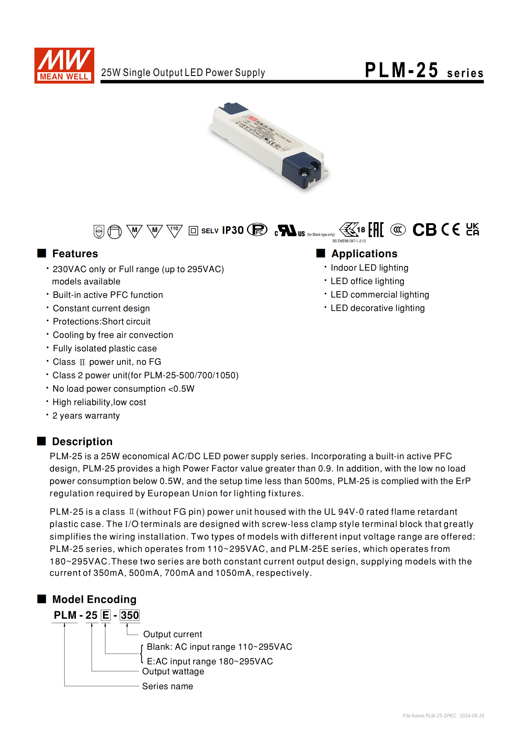 型號編碼規(guī)則:PLM-25(E)-XXX,E 代表窄輸入,XXX 為額定輸出電流(350/500/700/1050mA)。