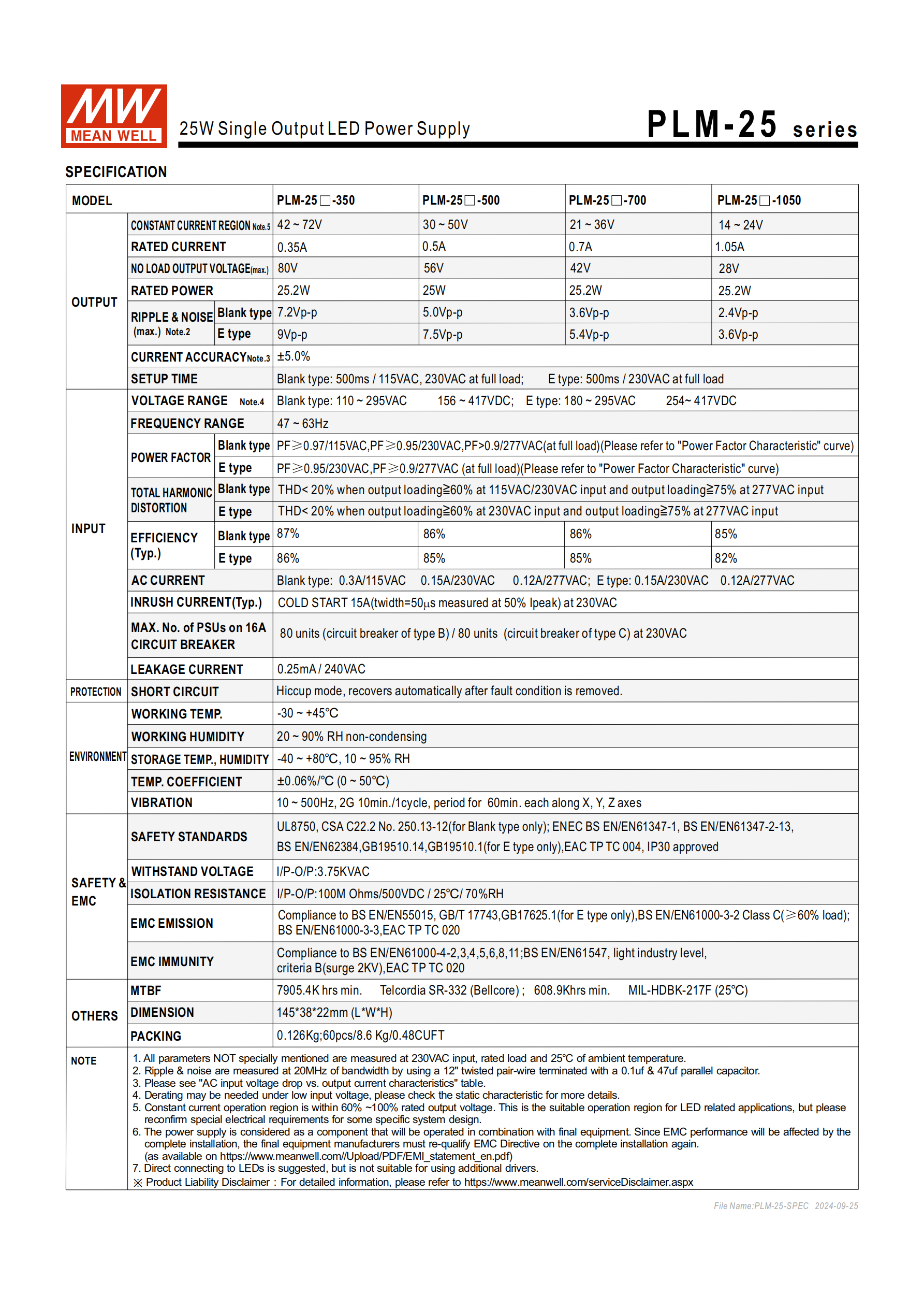 | PLM-25-350 | 0.35A | 30~50V | 42V | 25.2W | 3.6Vp-p | 87% | 86% |
