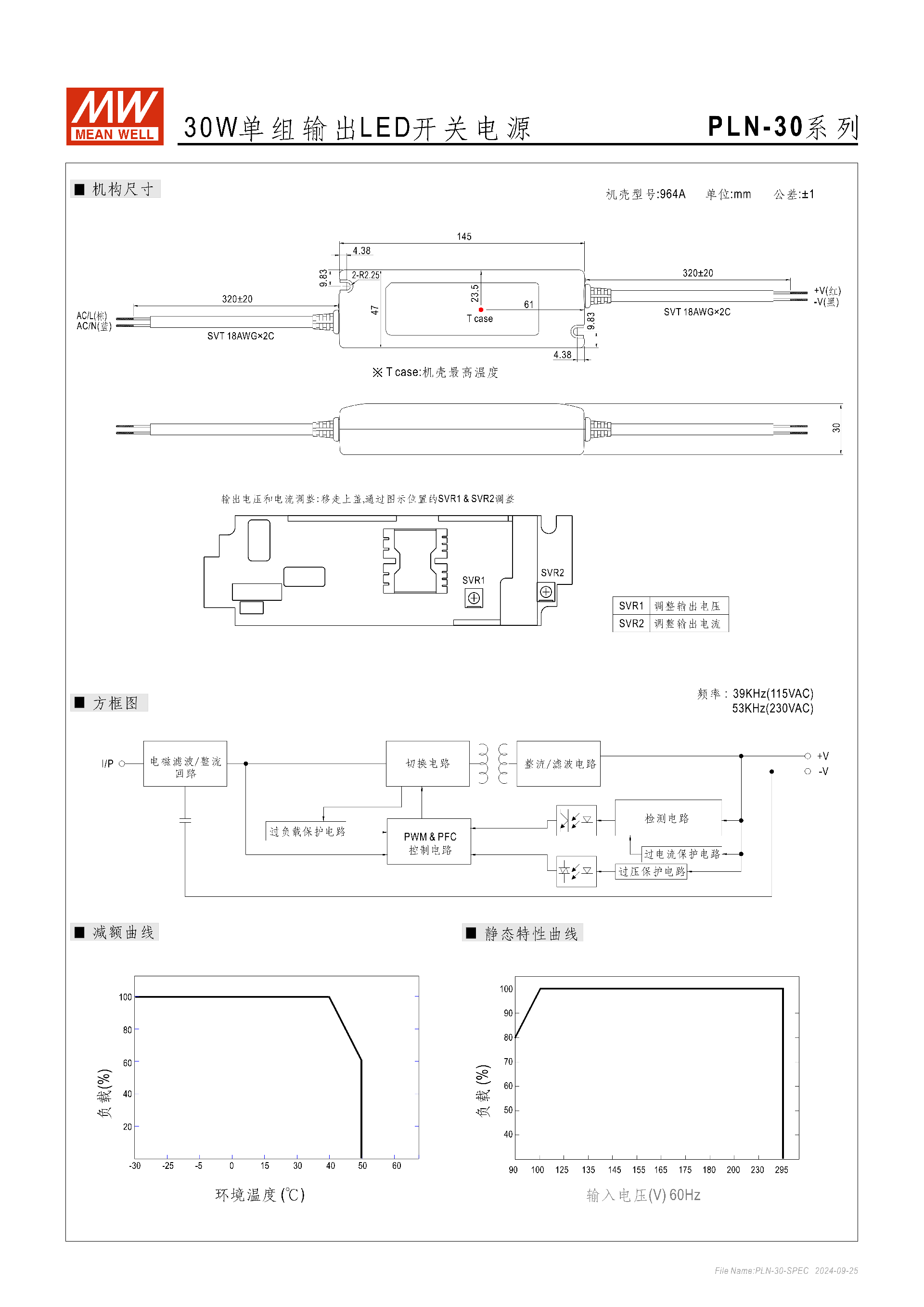 | PLN-30-27 | 27V | 1.12A | 30.24W | 2.3Vp-p | 18.9~27V | 3%~-25% |
